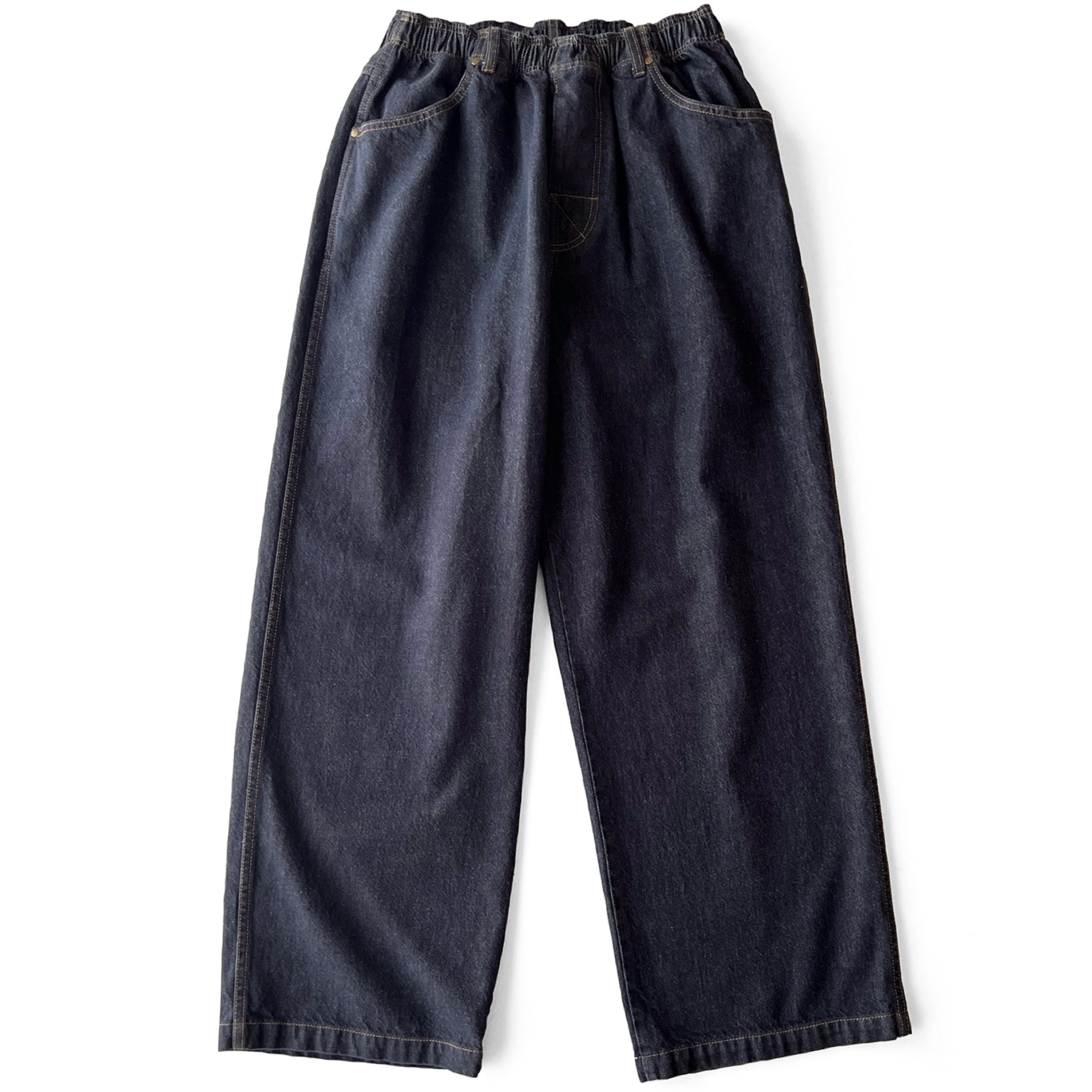色落ちのしにくい反応染めのデニム生地を使用。 洗濯後もトレンドのリジット感ある雰囲気をキープ出来る1着。 シルエットは25SSでも好評だったストレートタイプから裾幅を若干狭く微調整したテーパード感の少ないシルエット。 ウエストはゴム仕様ながらベルトループも付くのでタックインでの着こなしにも対応。