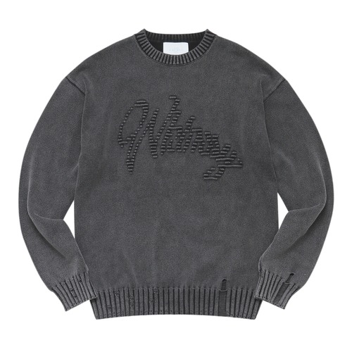 Emjayと名付けたタギングのロゴをタック編みという手法で立体に編み立て、そこにストーンウォッシュでフェード加工。立体で表現したロゴやリブの風合いが際立つニットと加工の相性をデザインで表現した逸品。