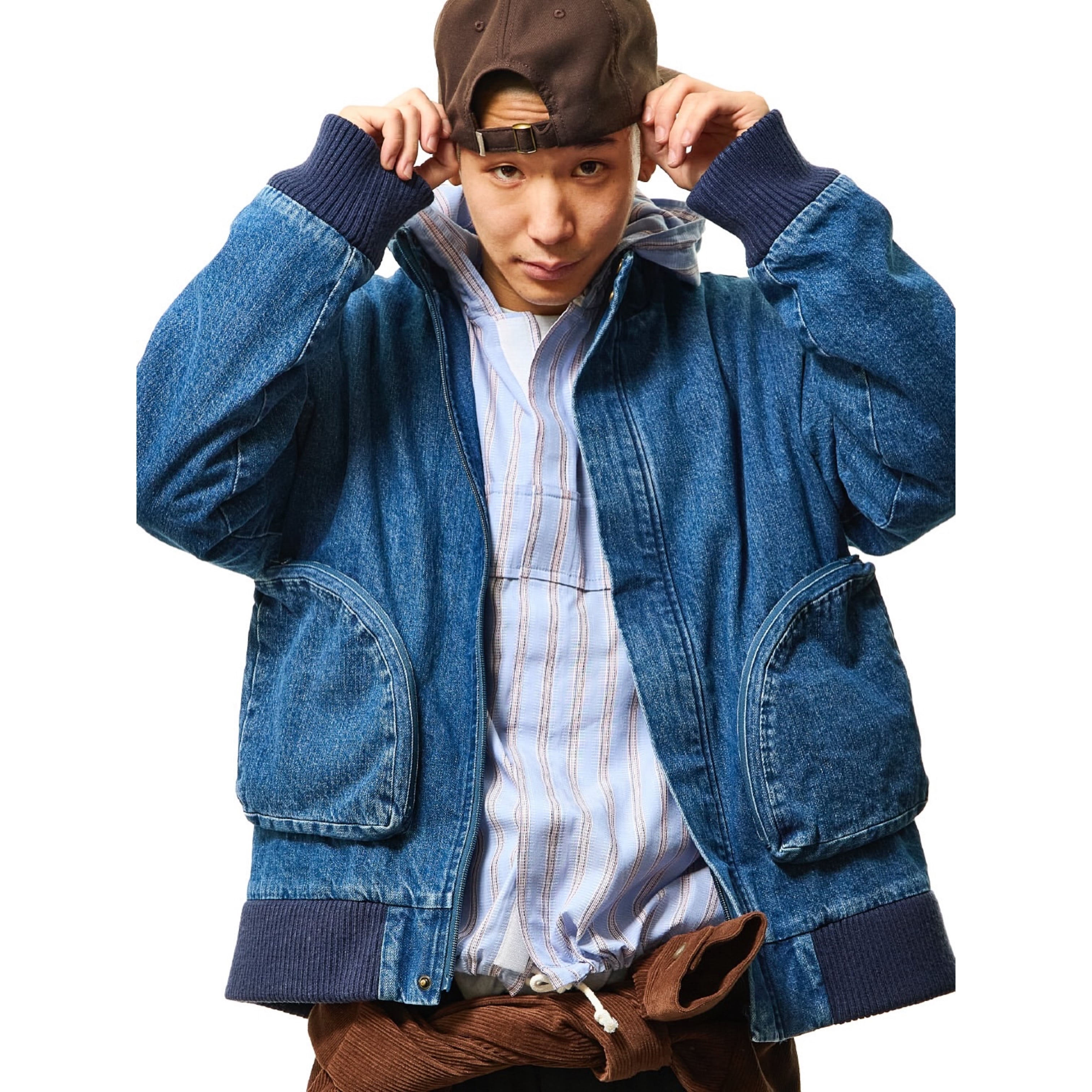 大きな立体ポケットが特徴的なジャケットはCDの収納ケースから着想を得て製作された。ハードウォッシュしたデニムにライナーはフリースを採用。