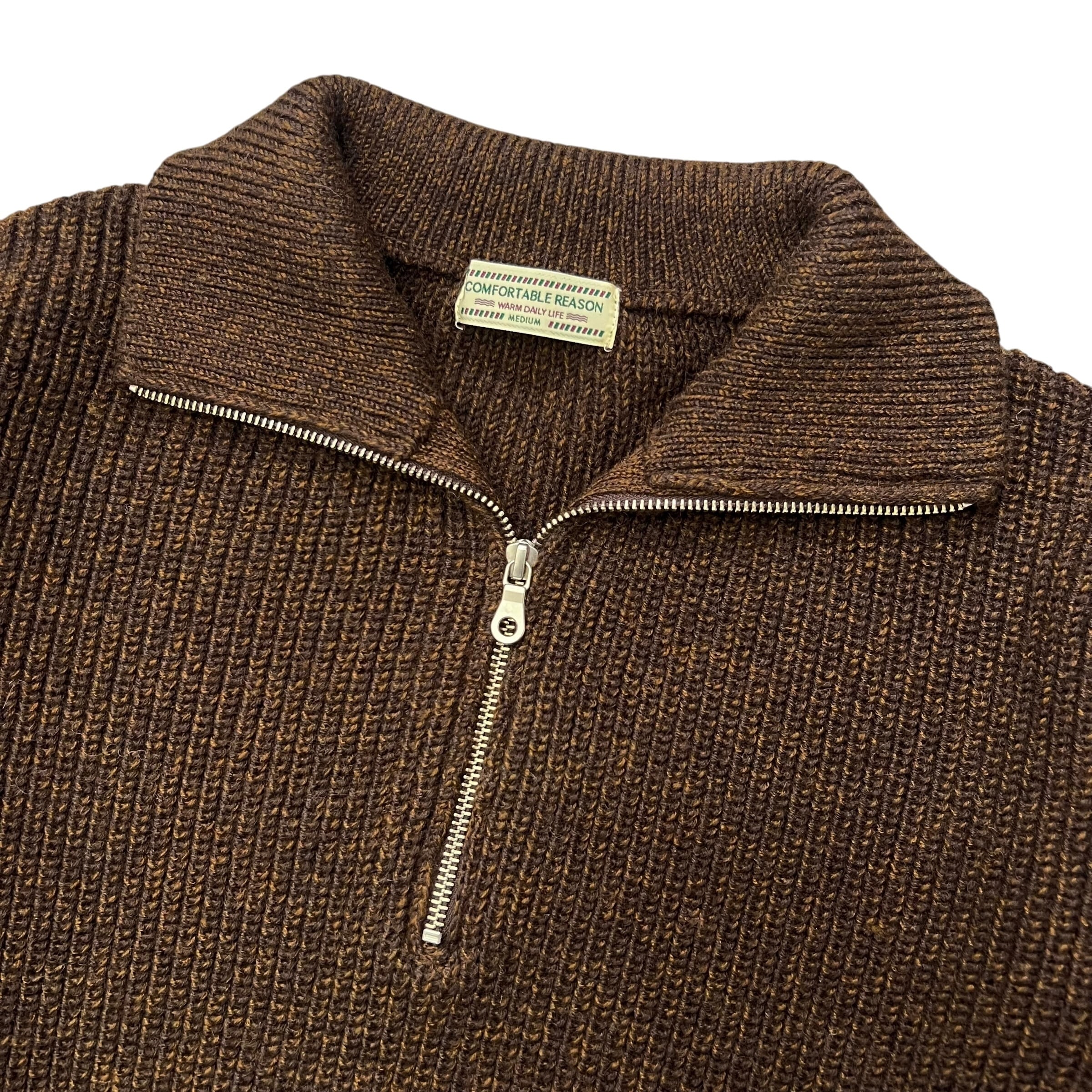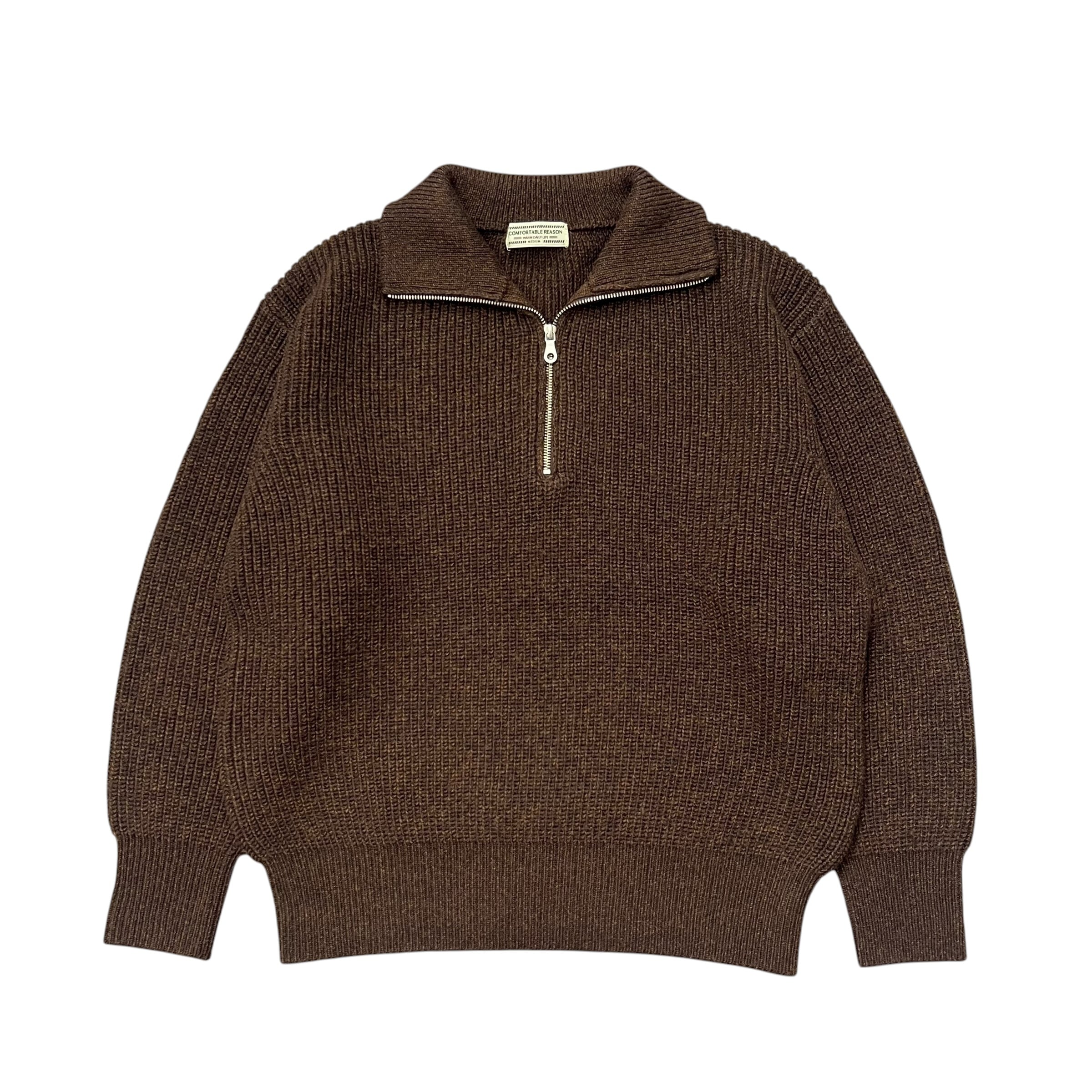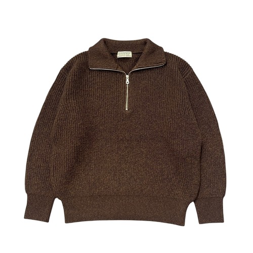 ウールアクリル素材でミドルゲージのハーフジップニット。 衿は折り返しての着用も可能。 カジュアルになり過ぎないスマートなシルエット。 単色のNAVYとミックスカラーのBROWNの2色展開。