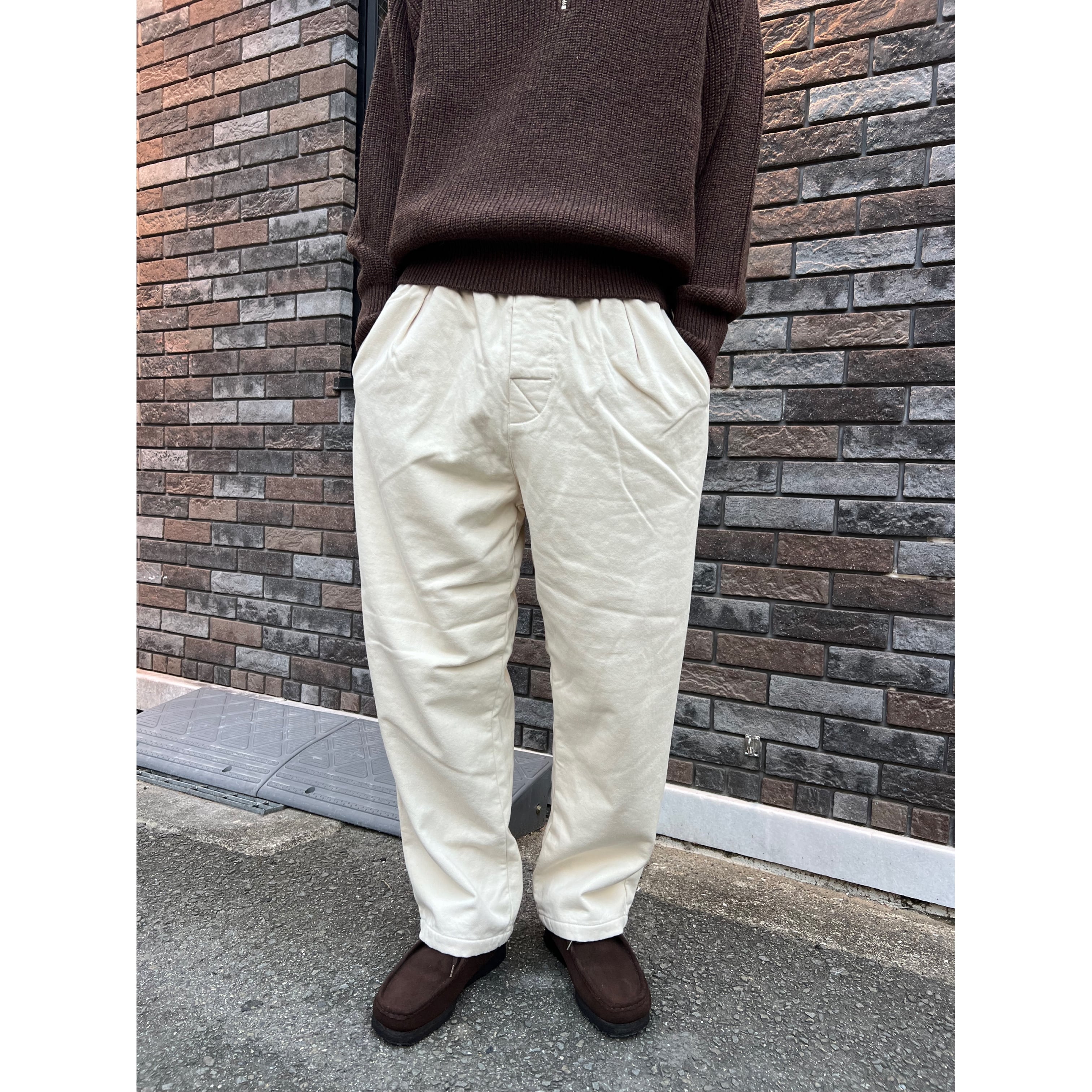 米軍のレイヤリングシステム”ECWCS Level3”のフリースが再現された 生地を裏使いしたスラックス。 コットン素材によるイージーケア性とフリース裏使いによる保温性が特徴。 シルエットはDaily Slacksのテーパード感あるシルエットから 生地の厚みを考慮し股上・裾幅をアップデートしたシルエット。 ウエストはゴム仕様ながらベルトループも付くので タックインでの着こなしにも対応。