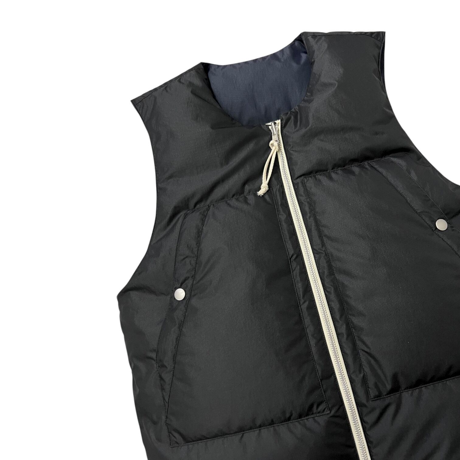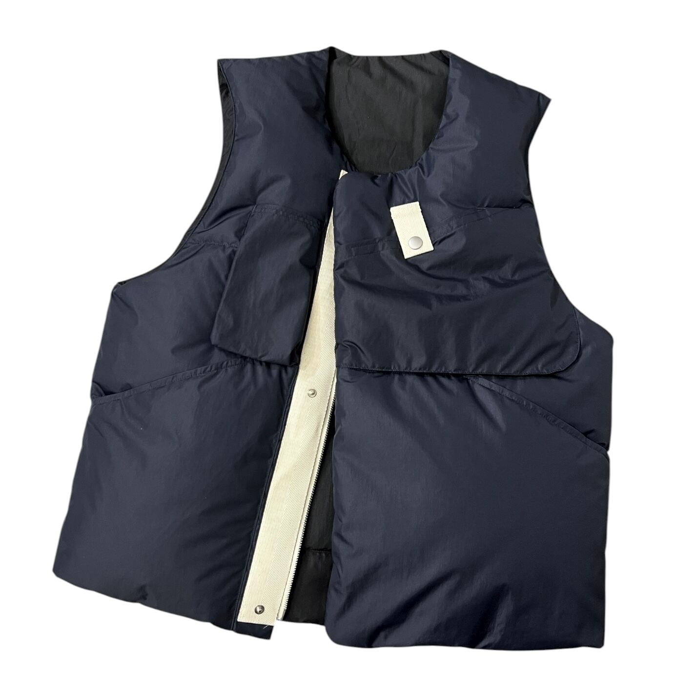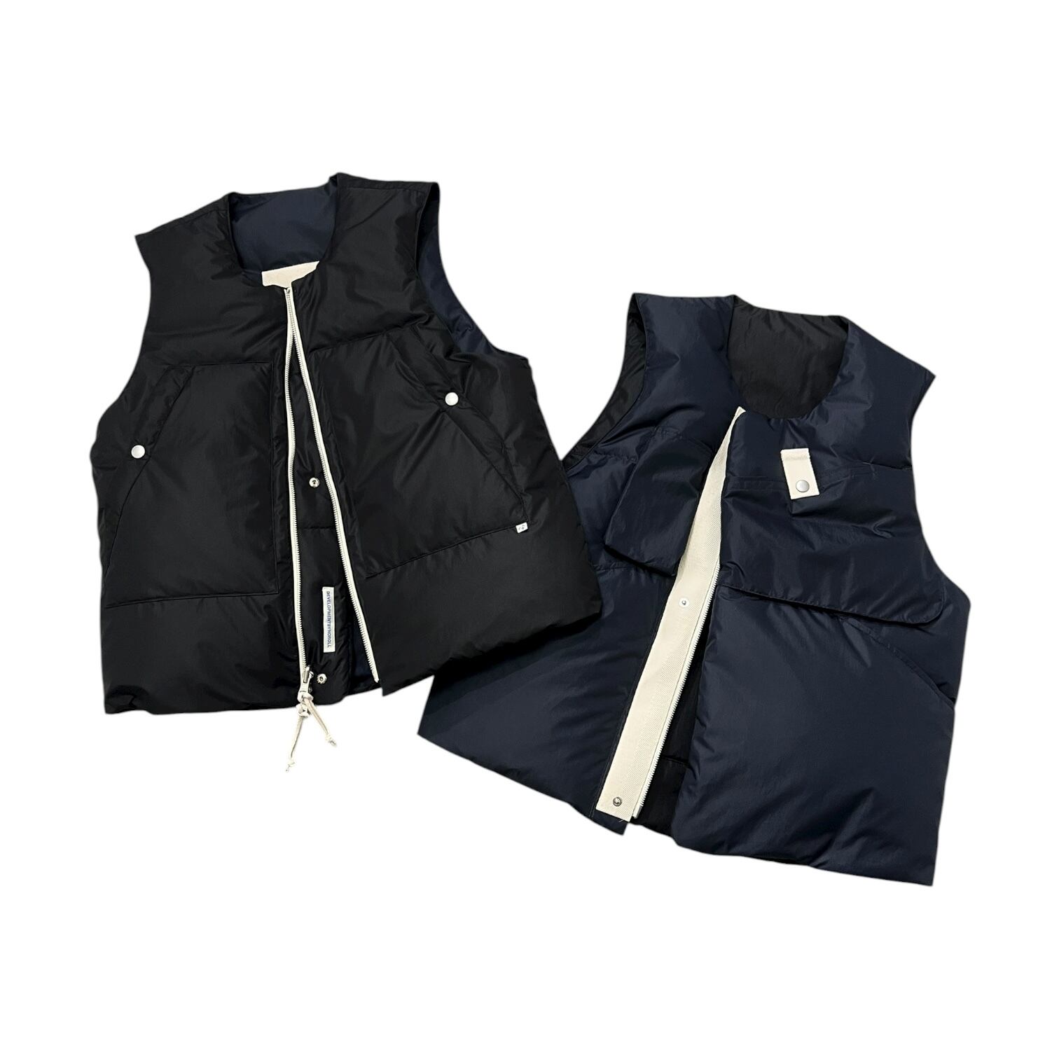 イギリス産ダックダウンを使用したリバーシブルのダウンベスト。正面のみダウンパックが二層のダブルチューブ、背面は一層のダウンパックにすることで正面からのボリュームをキープしつつ圧迫感のない着心地、軽さ、保温性を確保しています。 700 FILL POWER◎。