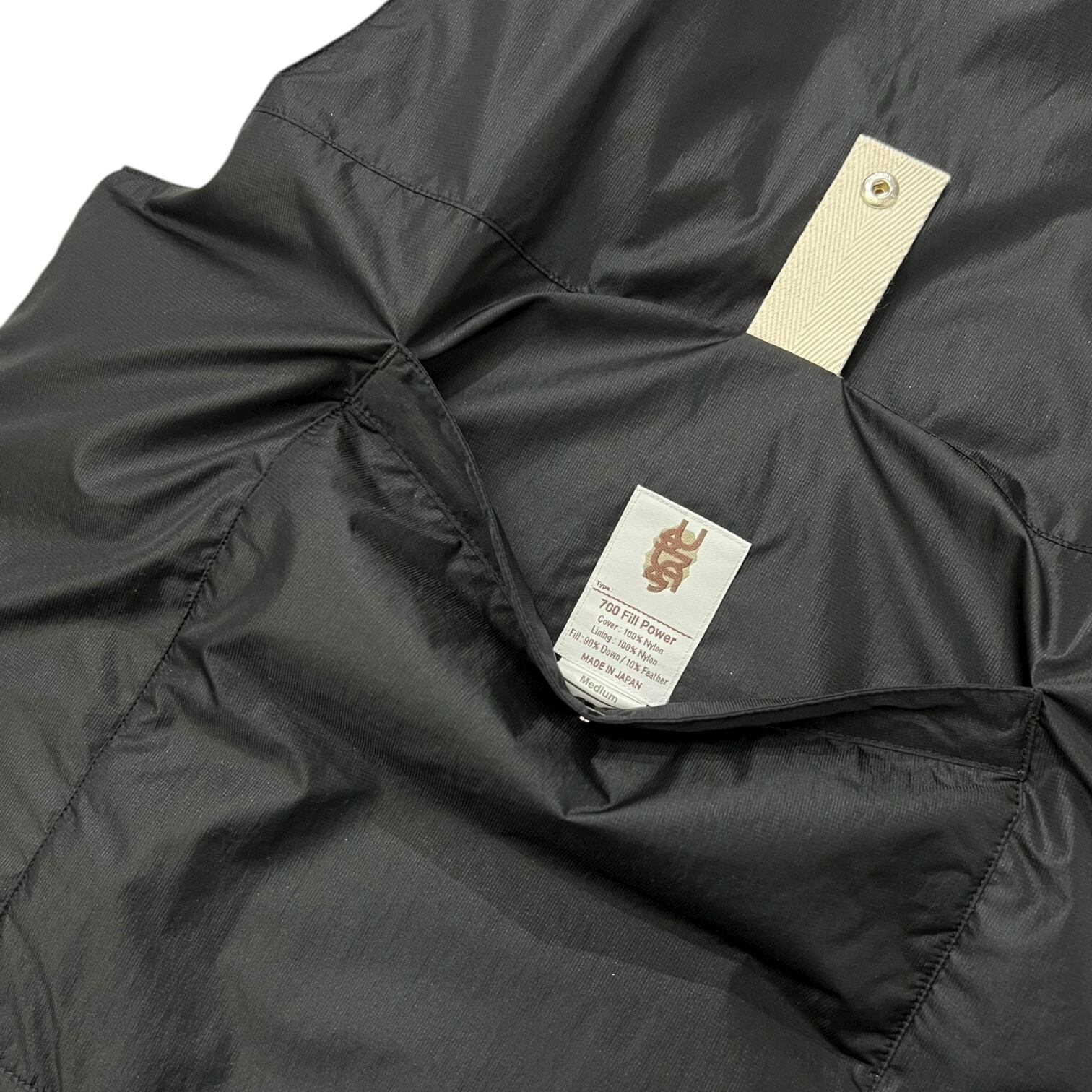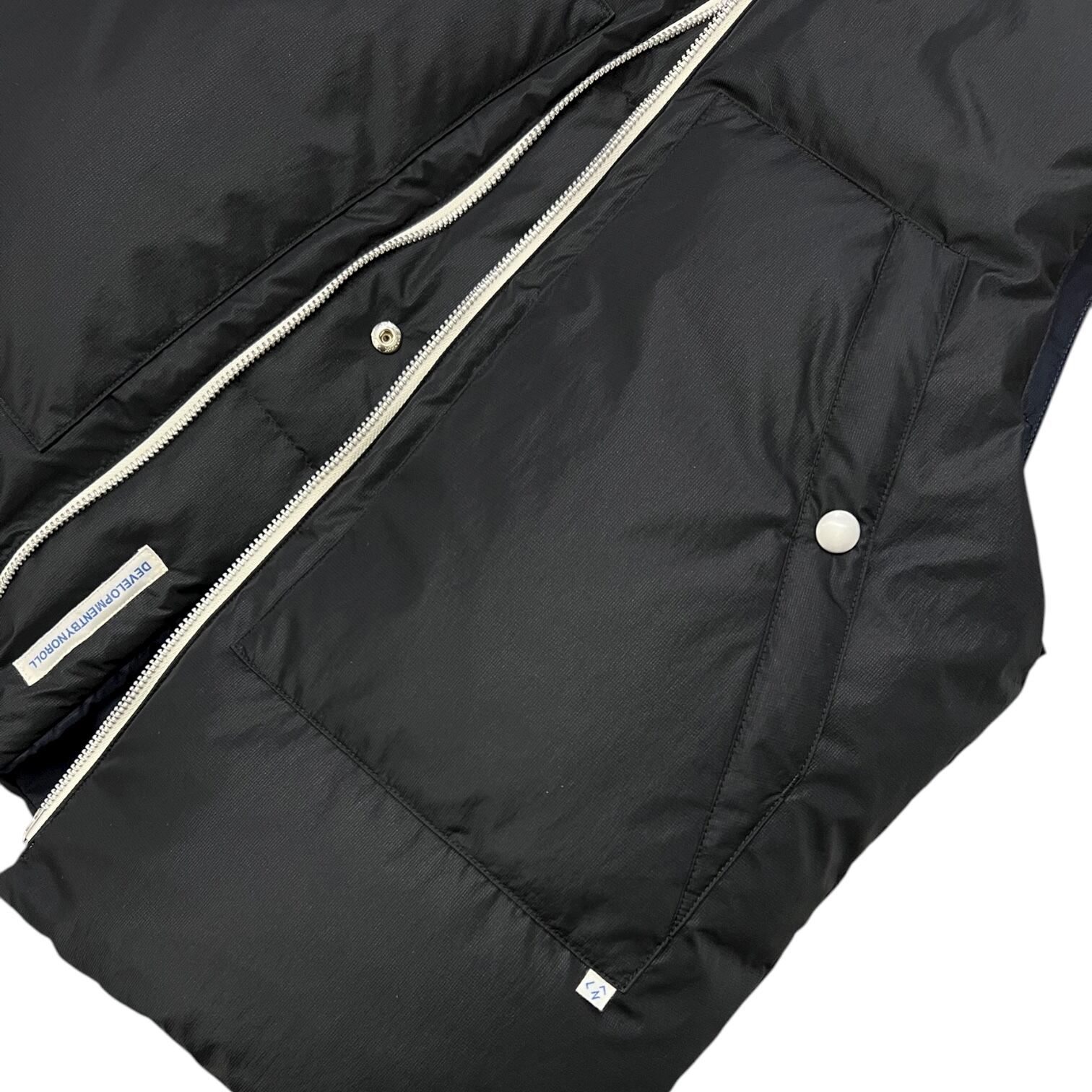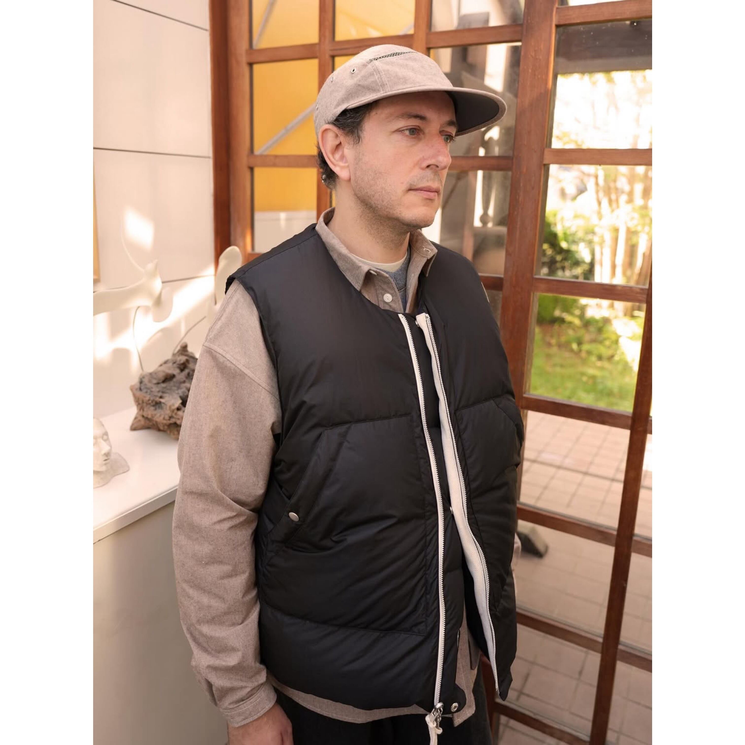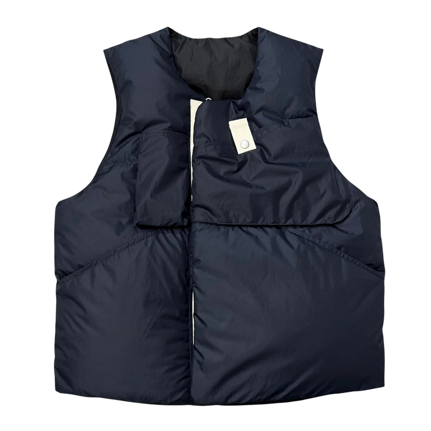 イギリス産ダックダウンを使用したリバーシブルのダウンベスト。正面のみダウンパックが二層のダブルチューブ、背面は一層のダウンパックにすることで正面からのボリュームをキープしつつ圧迫感のない着心地、軽さ、保温性を確保しています。 700 FILL POWER◎。