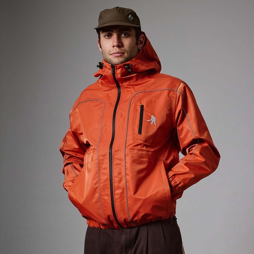 ナイロン100%シェル。耐水性接着膜。耐水性ジップ。フードとウエストバンドの調節可能な同期タブ。反射配管。
