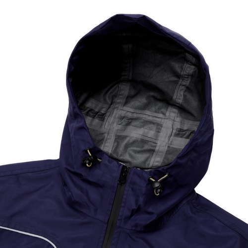 ナイロン100%シェル。耐水性接着膜。耐水性ジップ。フードとウエストバンドの調節可能な同期タブ。反射配管。