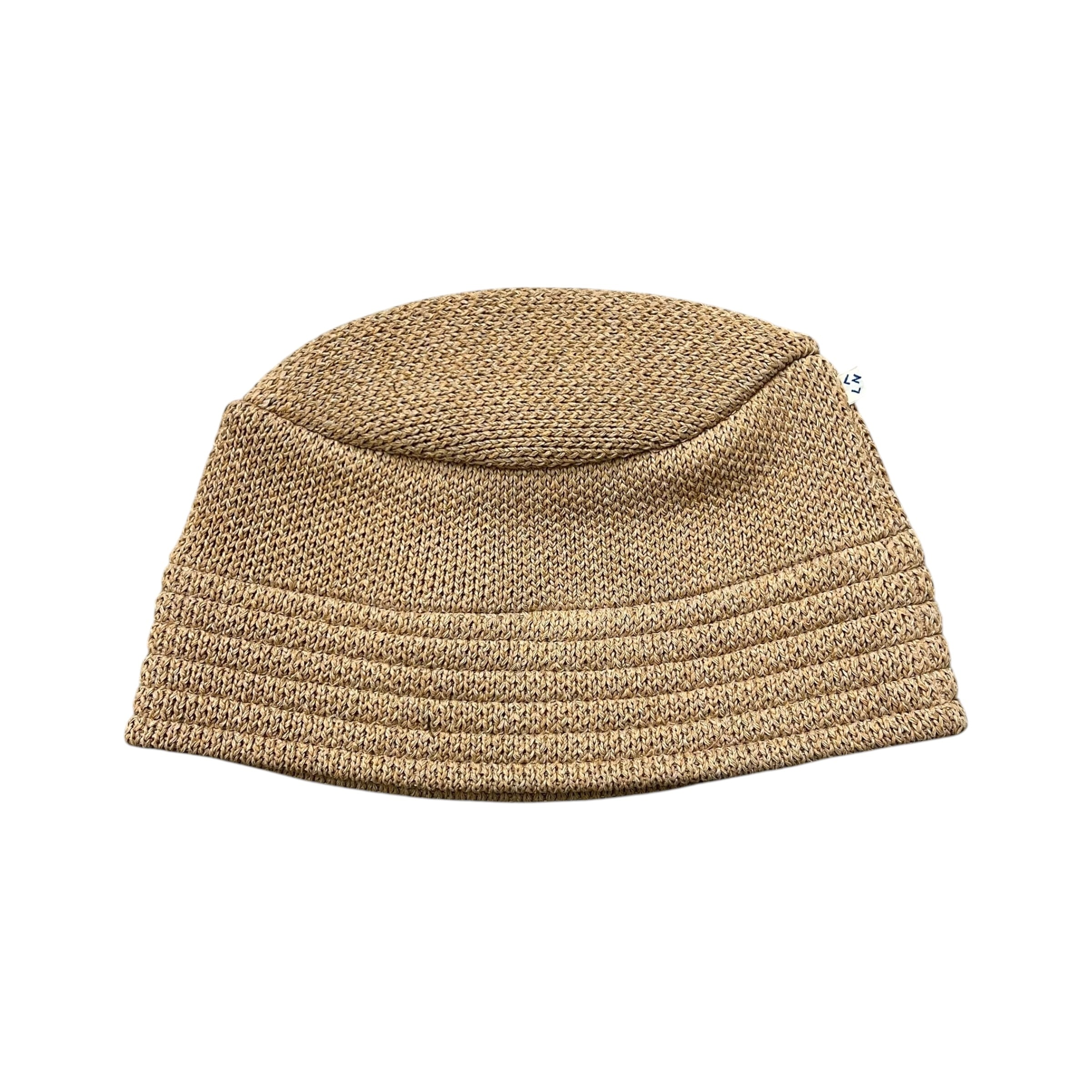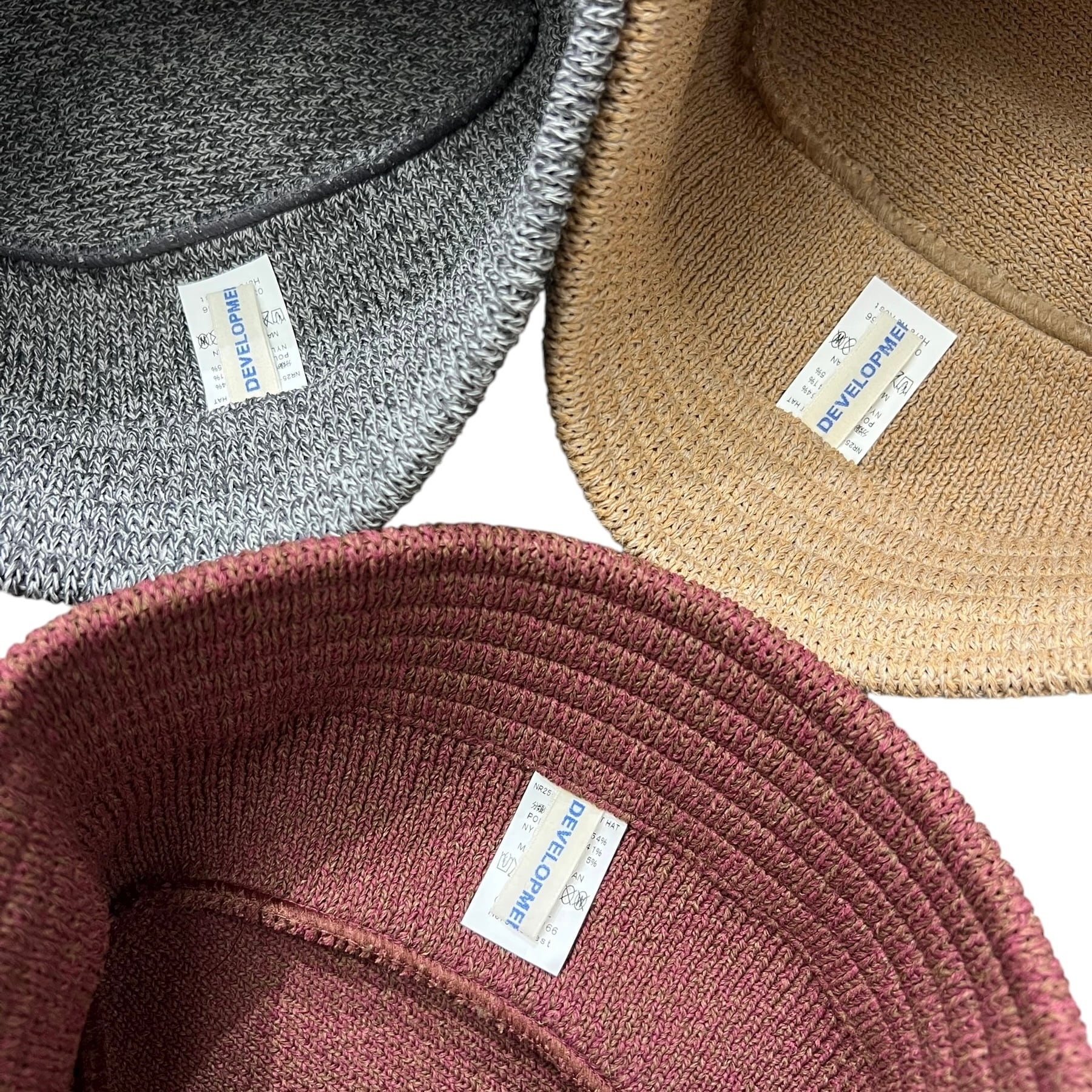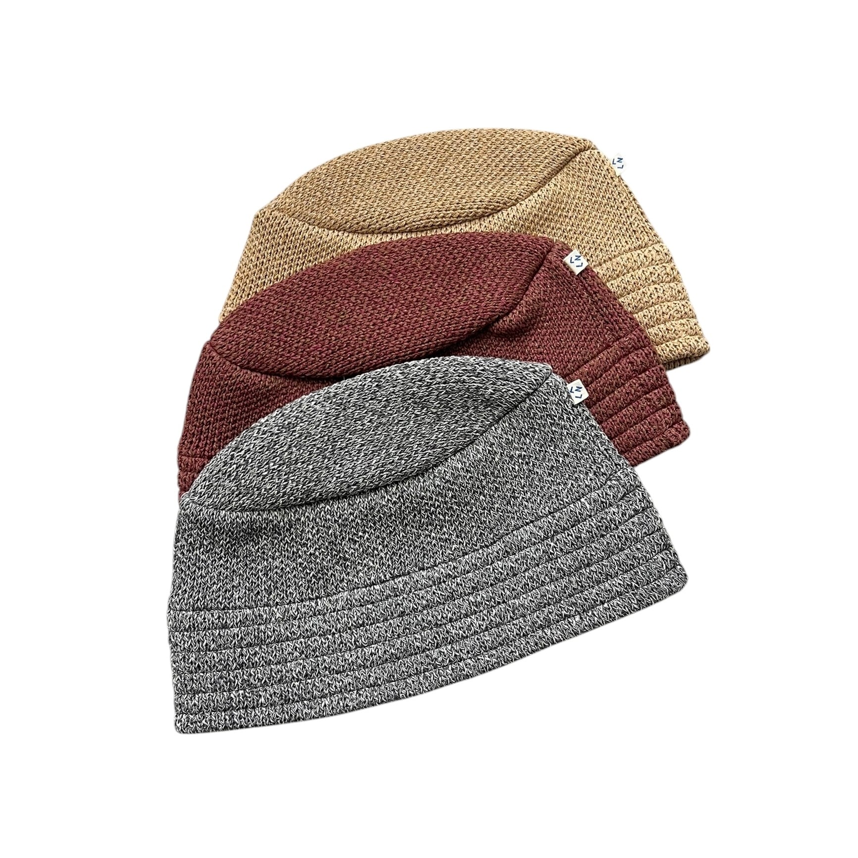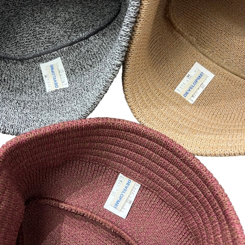 和紙,ポリエステル,ナイロンをブレンドしたシャリ感ある糸を2色混ぜ撚った定番ニットバケットハット。和紙素材は優れた吸水速乾性を持ち、毛玉ができにくく、防シワ性と機能性の高さがあります。
