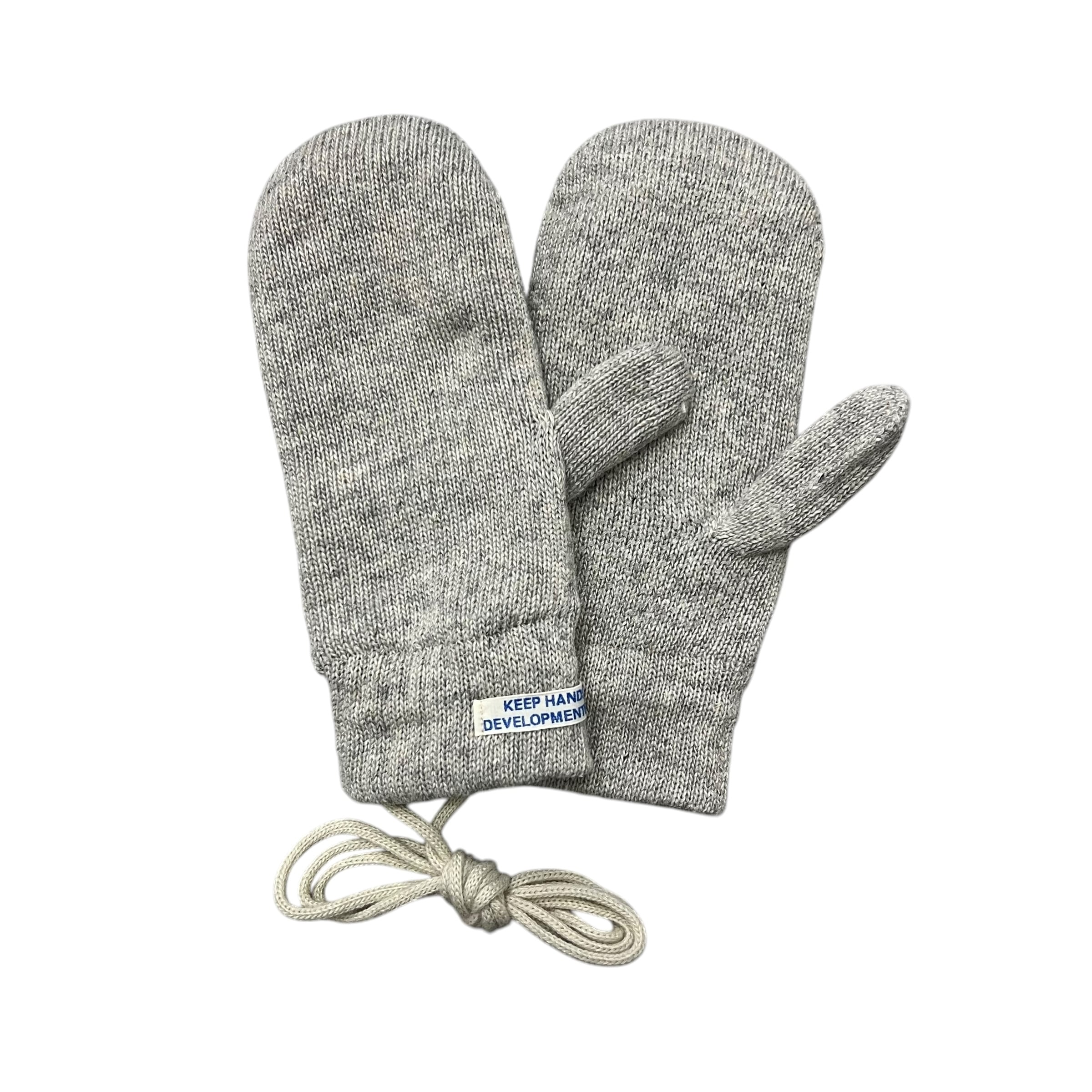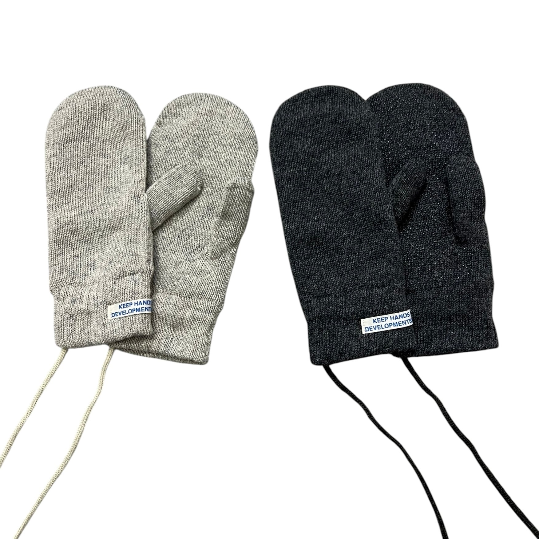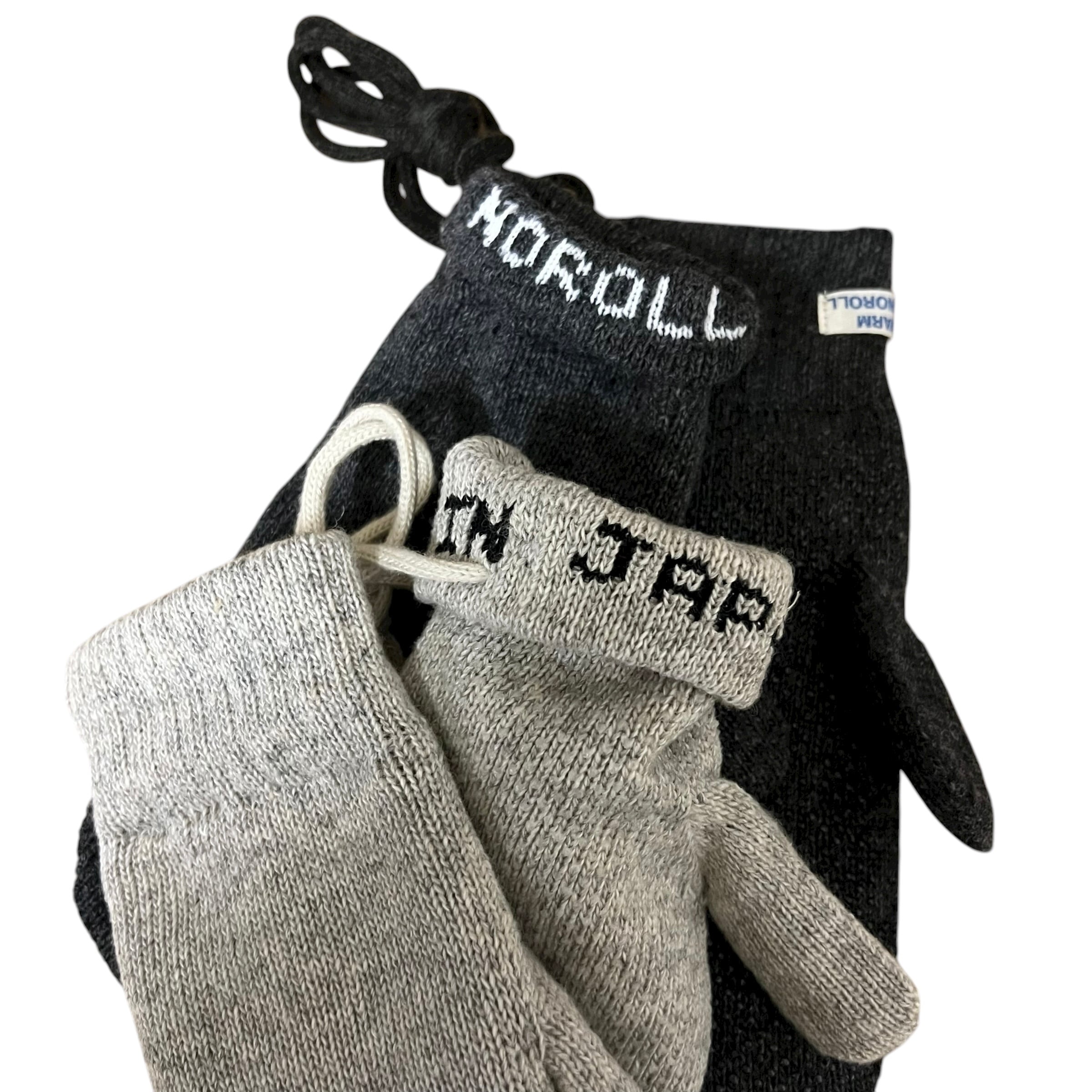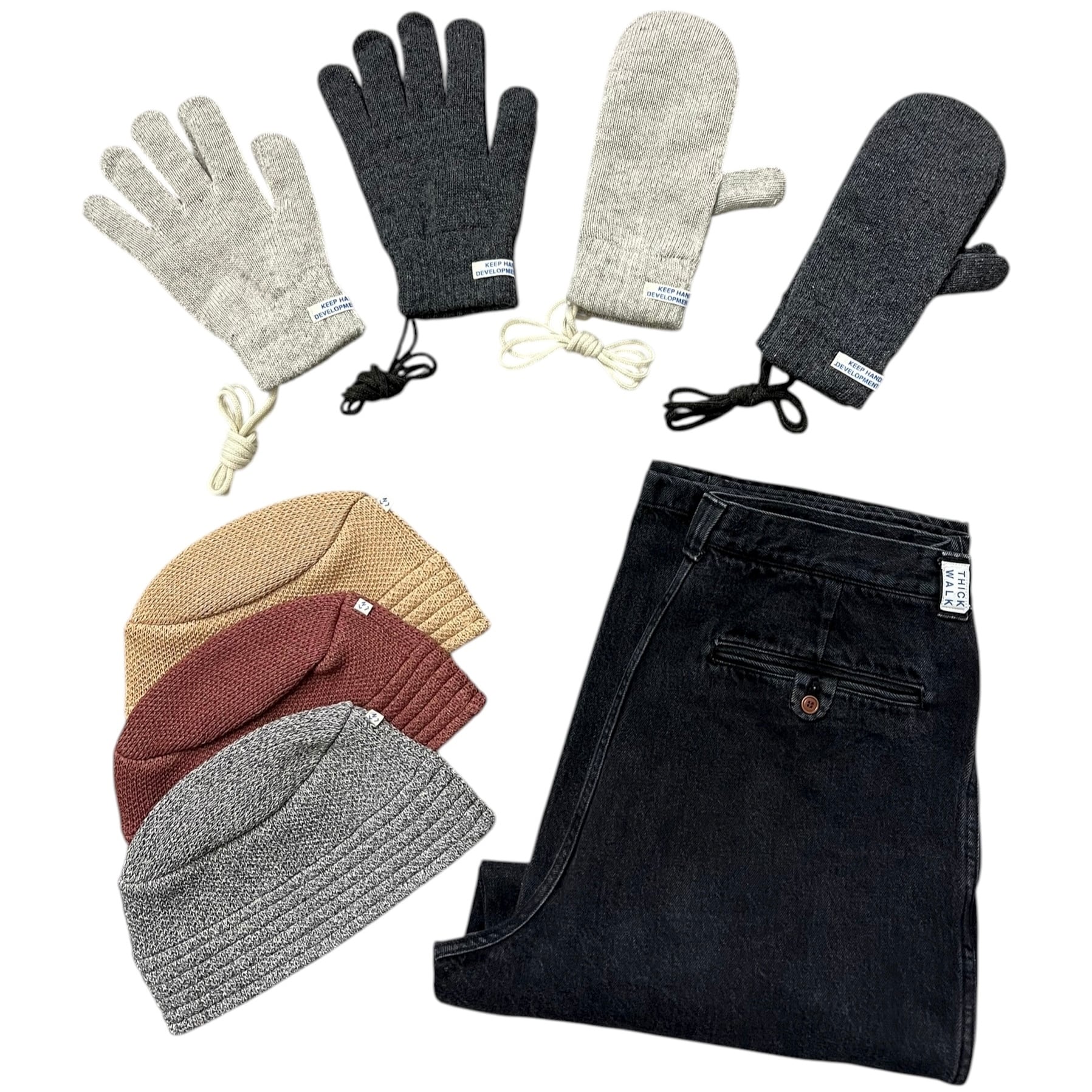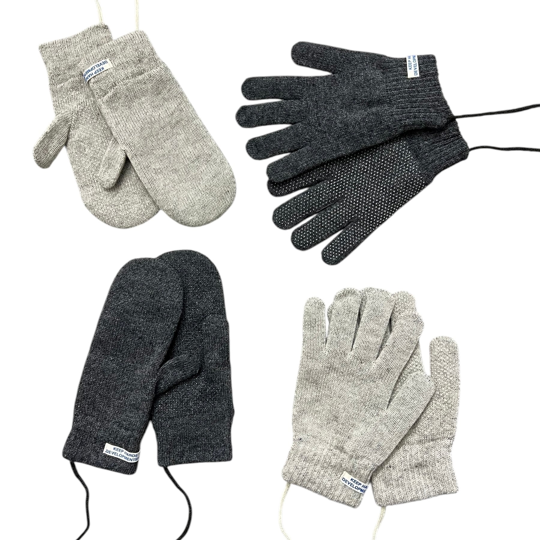 アップサイクルウールと廃棄ペットボトルを利用したリサイクルアクリルの糸を使用した手袋。裏地のある二重手袋で保温性を確保。