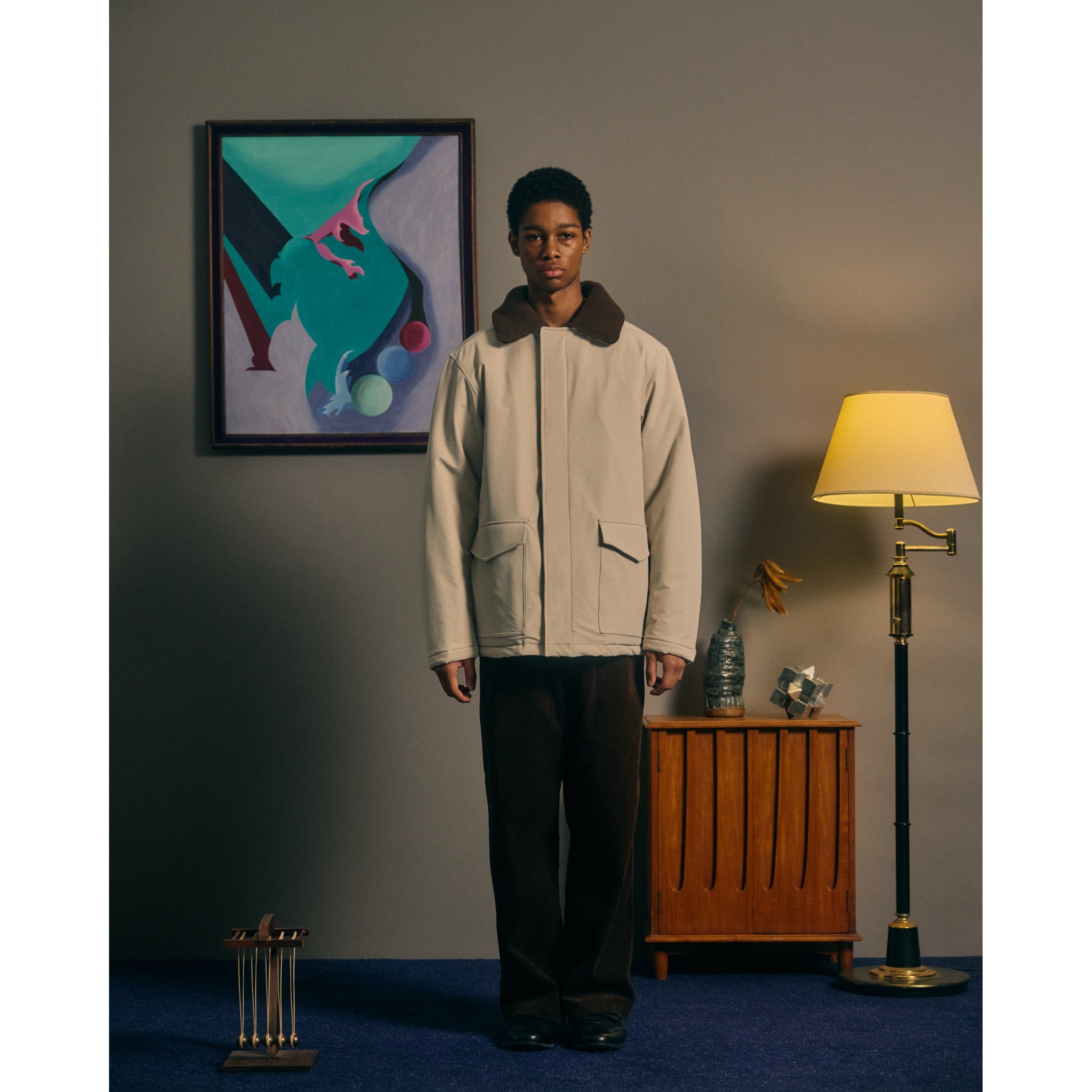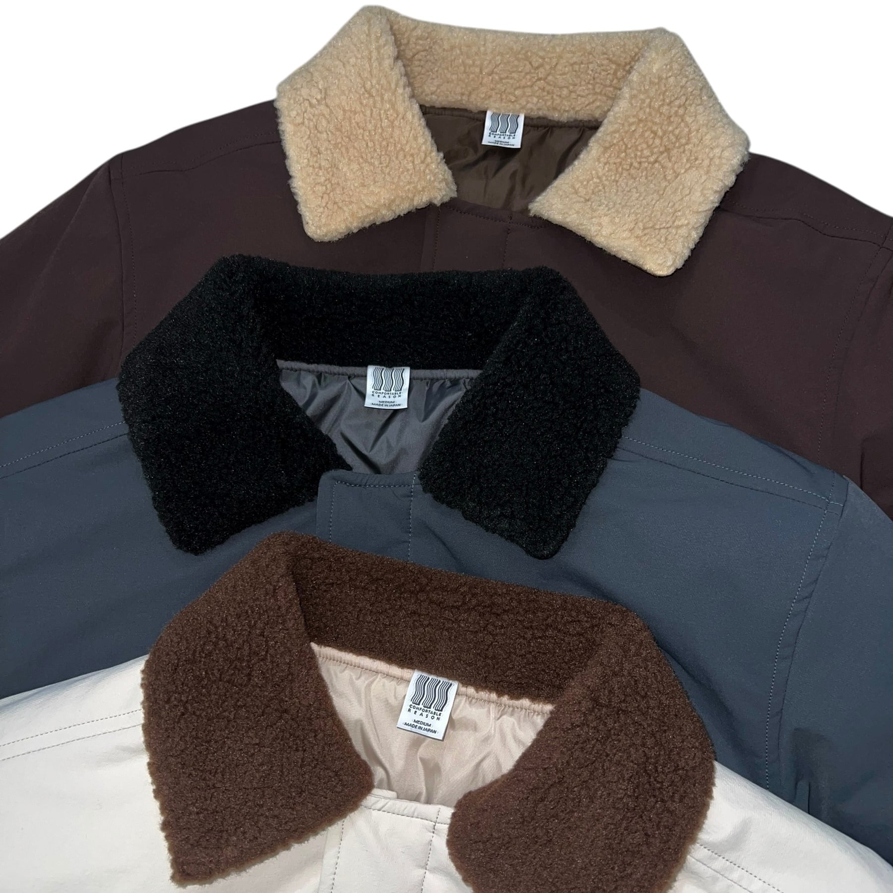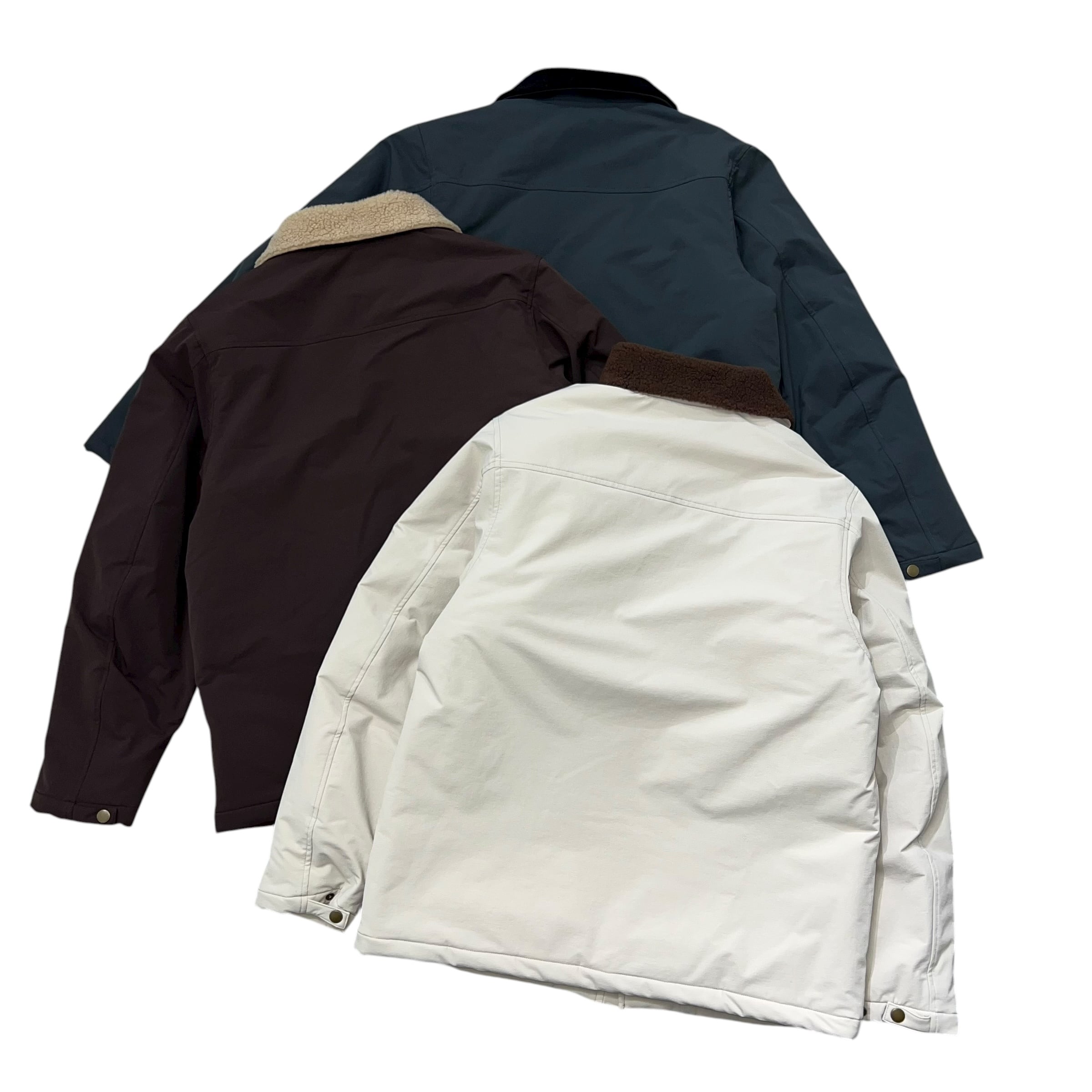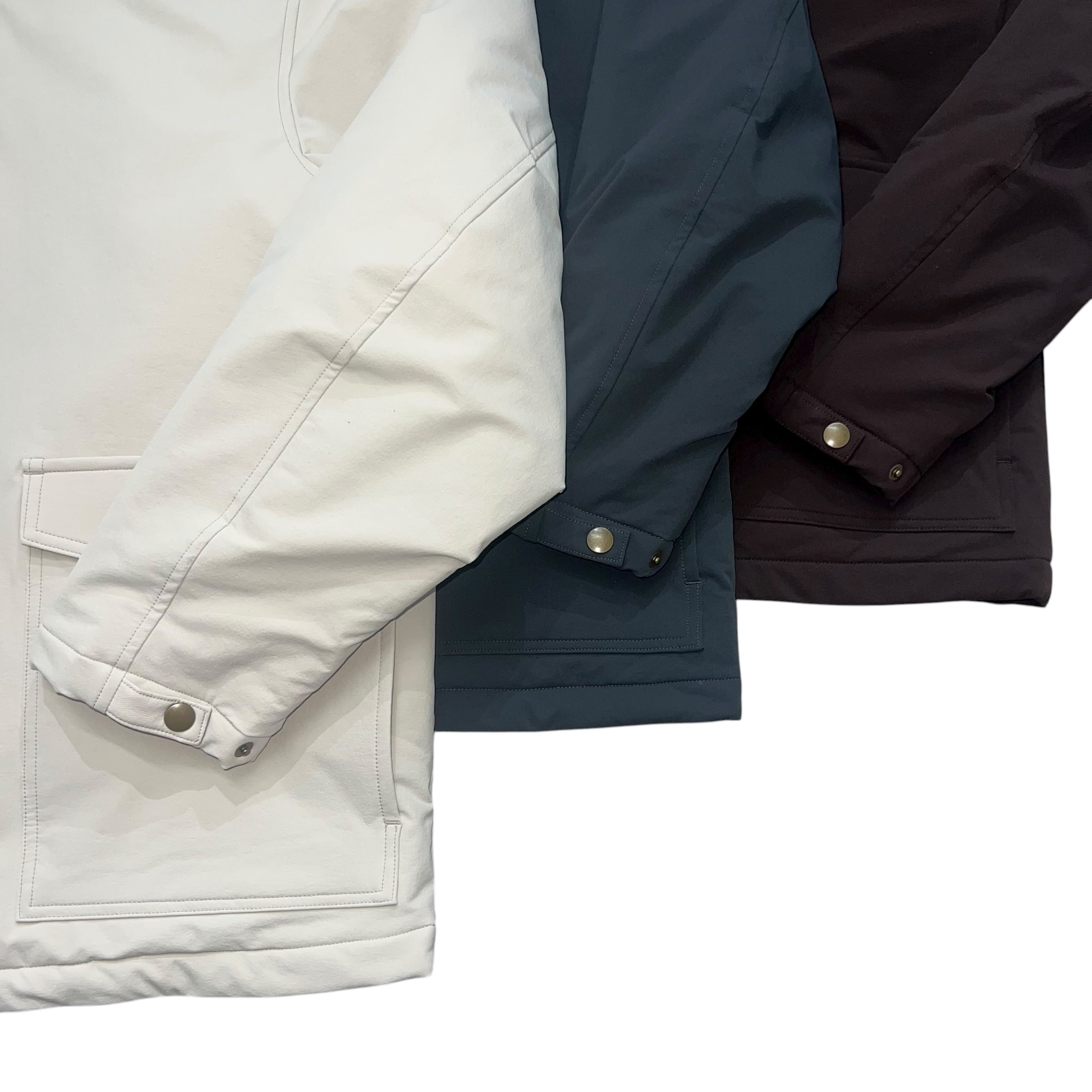 撥水・ストレッチ性のあるナイロン素材を使用したミドル丈の中綿ジャケット。 軽さと暖かさを追求したsunstate2の高機能中綿を使用。 衿には密度の高いボアを配置しフライトジャケットライクな雰囲気を演出。 フロントの2WAYポケットと左右に配置した内ポケットで収納力もある1着。 前開きはダブルジップ、袖口はタブで調節可能。