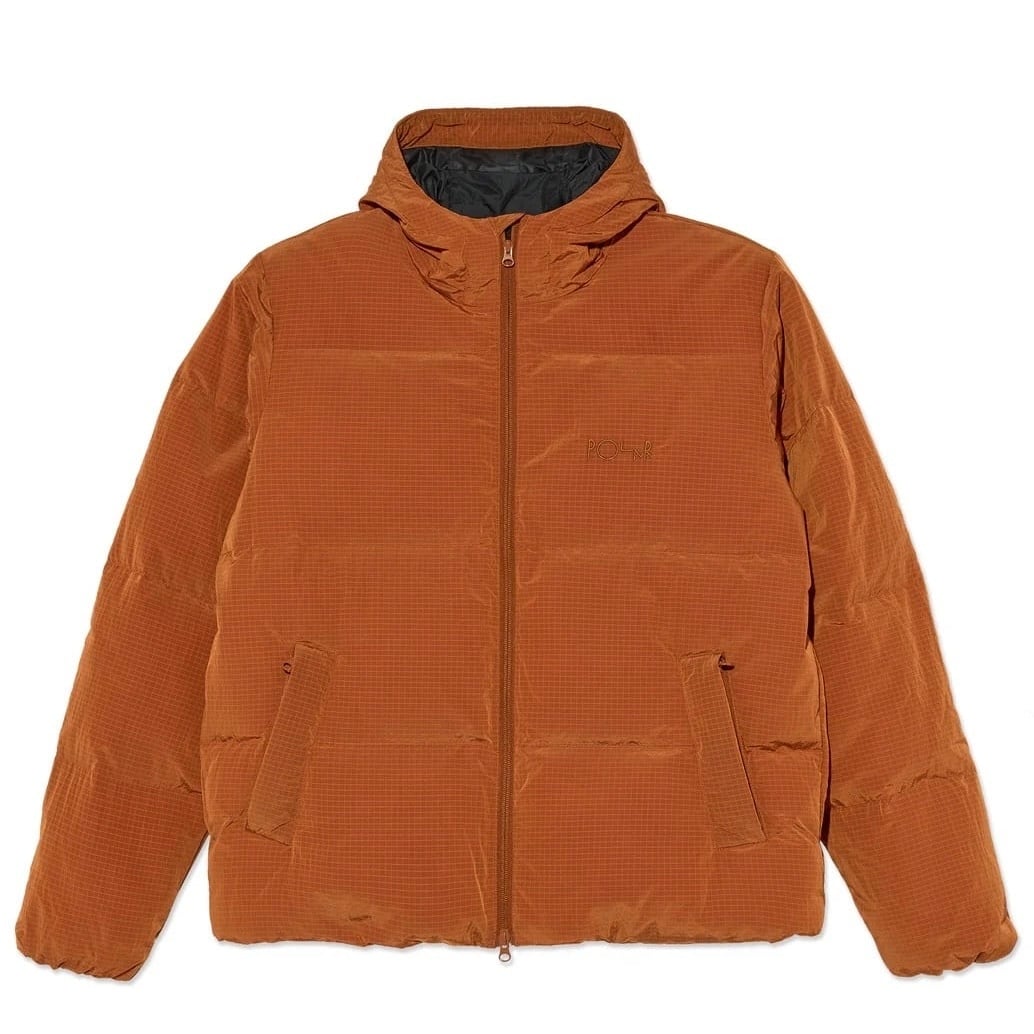 しわの寄ったタスラーリップストップナイロンに撥水加工を施したレギュラーフィットジャケット。 軽量のダウンブレンドパディングと滑らかな紬裏地は、清潔で絶縁された構造を作り出します。 反転した双方向ジッパー、ファスナー付きポケット、微妙なスクリプト刺繍が外装を洗練させます。 裾とフードに隠れた調整を施し、袖口と縁に見えない仕上げを施します。短丈で身幅、肩幅ワイドなボックスシルエットで着回し効きそうな逸品。