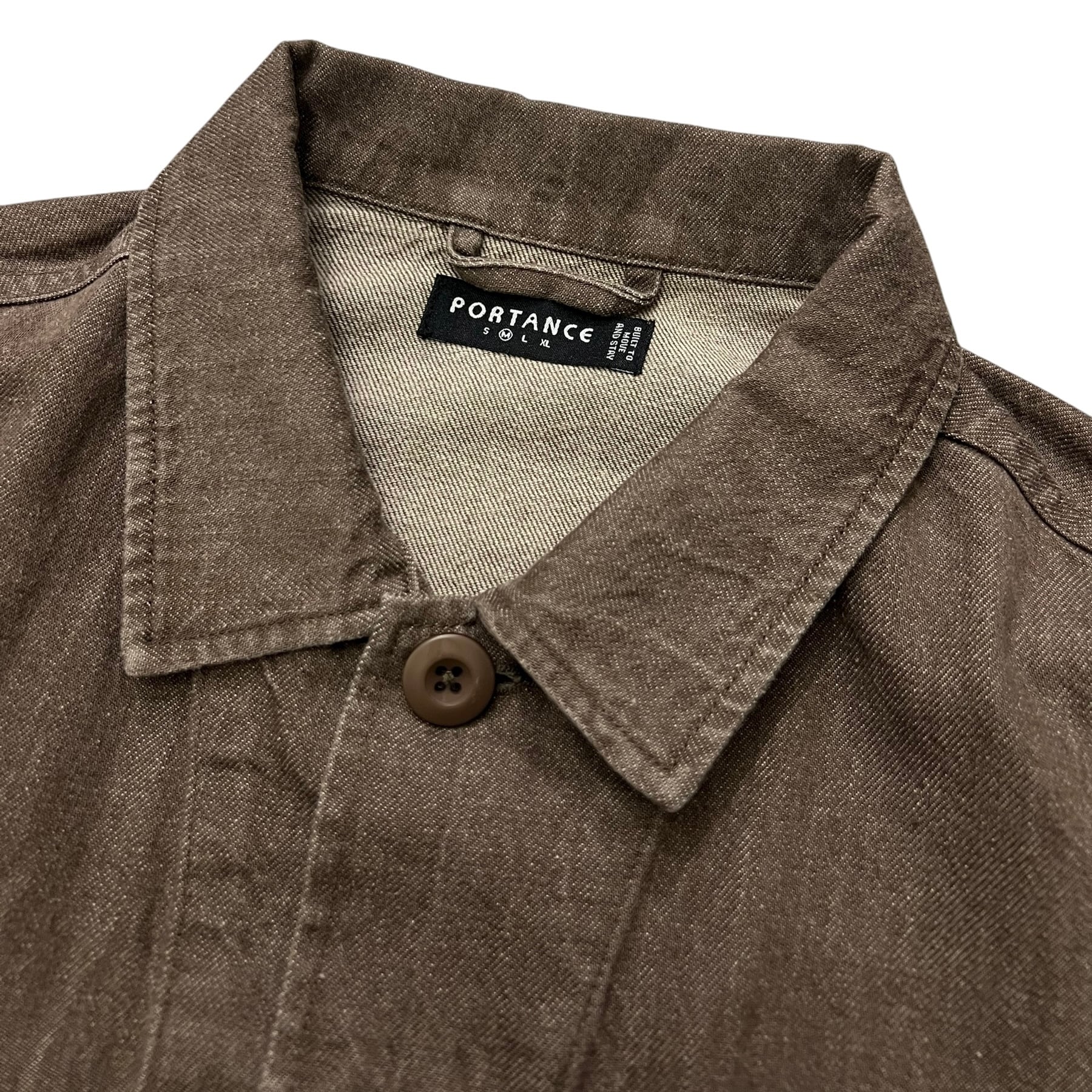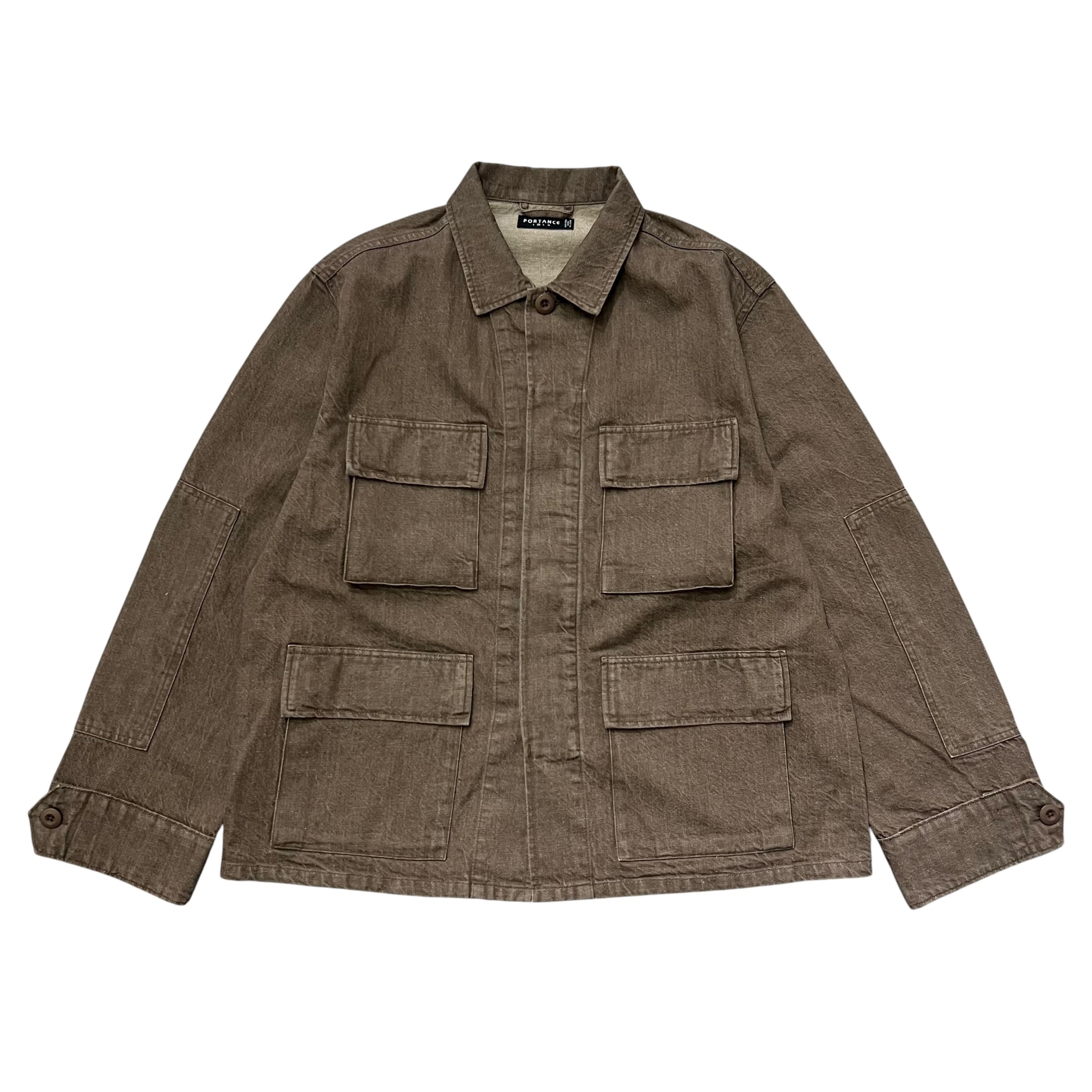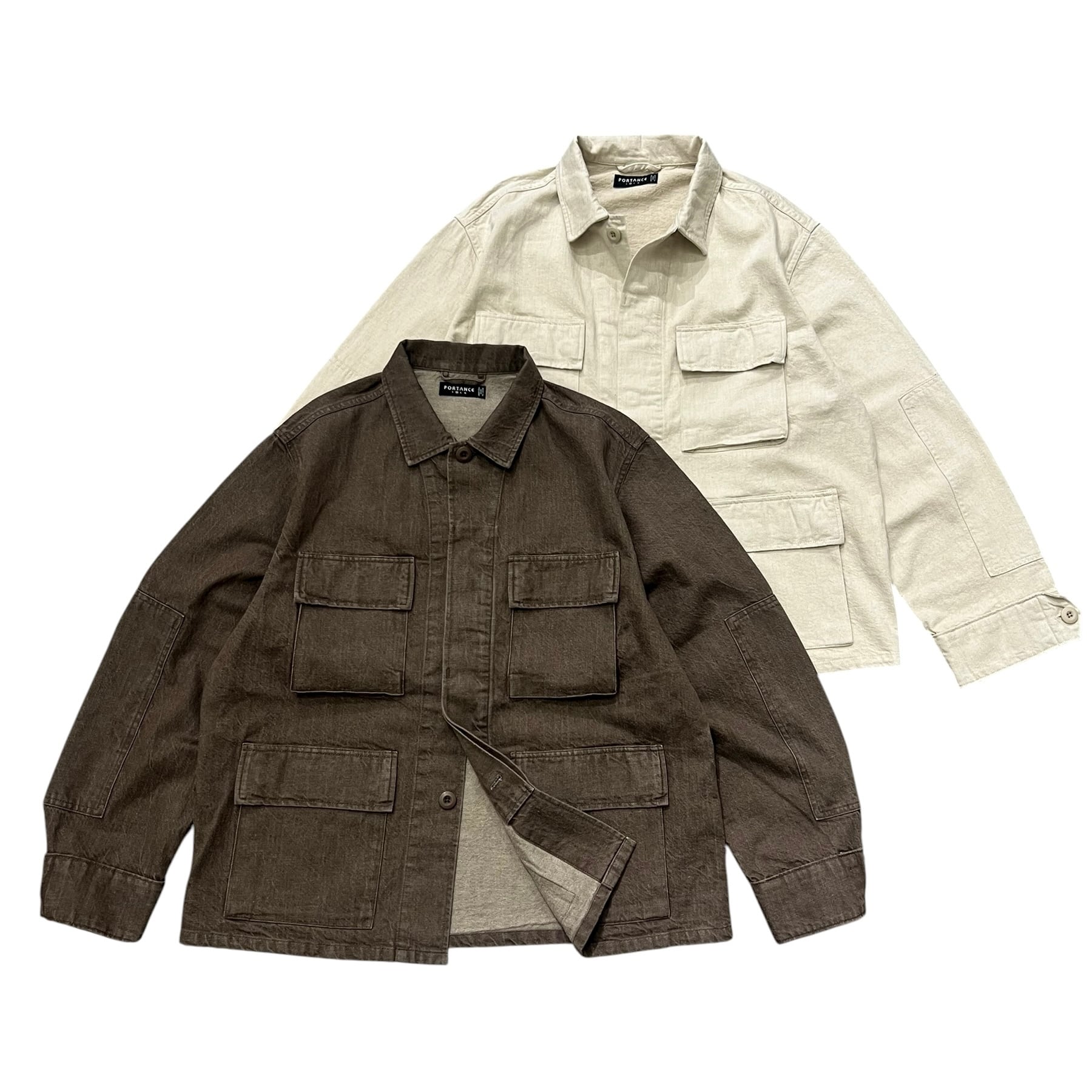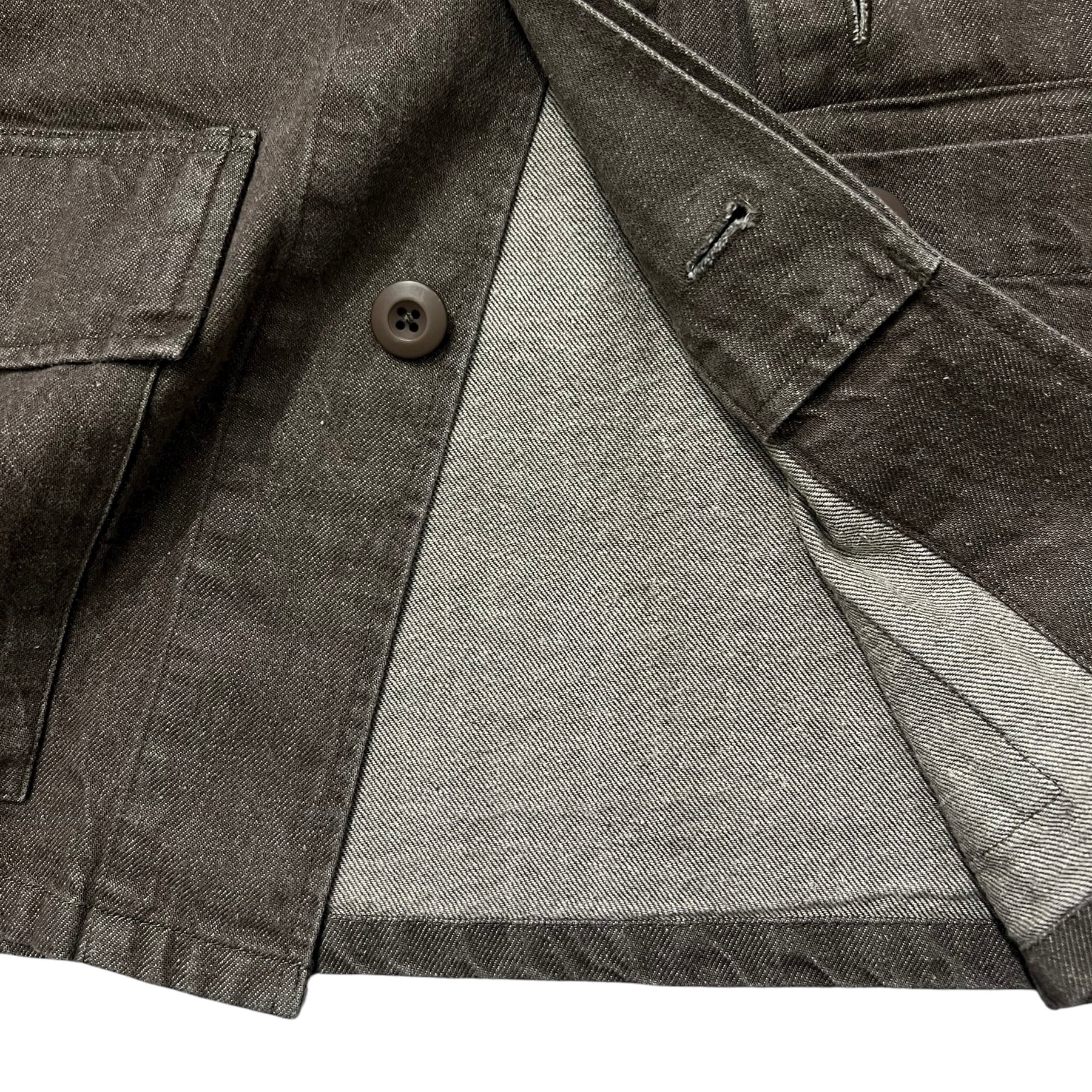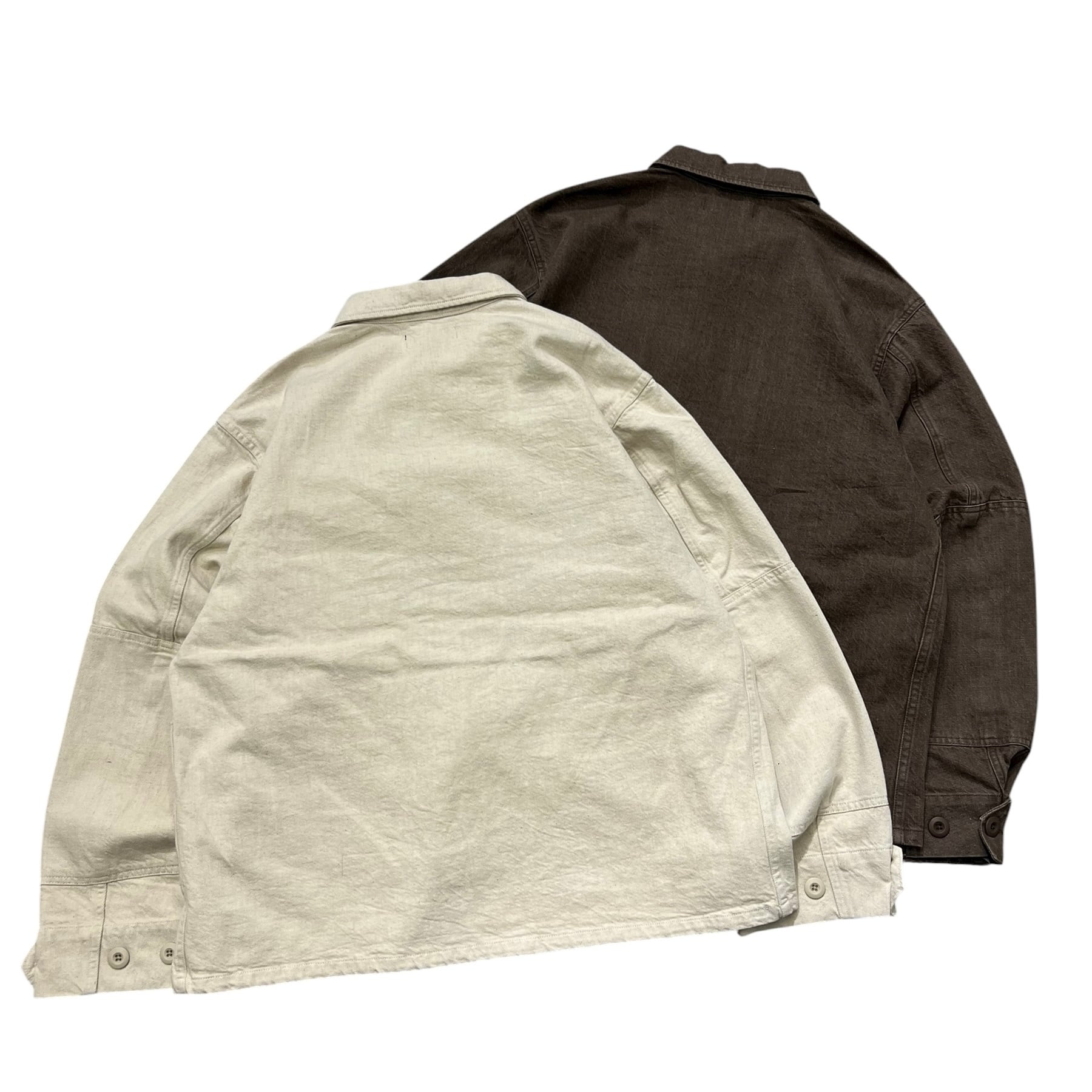 BDU jacket made from original hemp-cotton denim. Slightly short length with a wide body. Lightweight 9.5oz fabric, suitable for long-season wear.