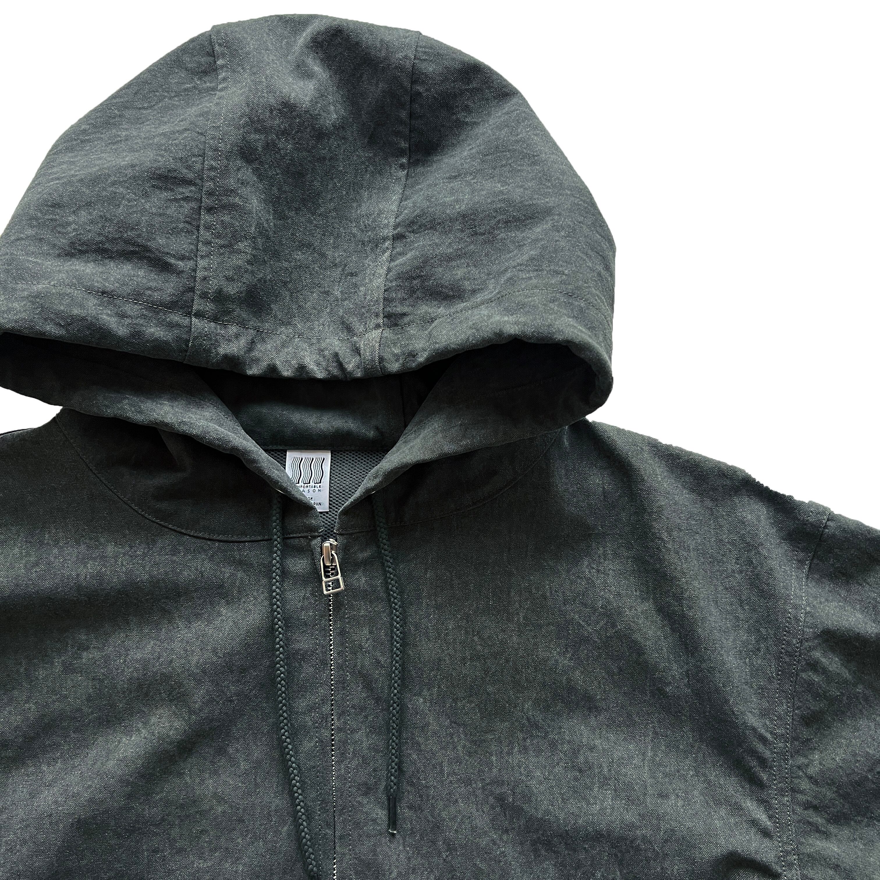 天然ライクなナイロン素材を使用したフードジャケット。 片面を顔料コーティング後にワッシャー加工が施された 独特なエイジング感のある素材を採用。 フロントはWファスナー開きで脇まで続く深さのあるポケットにより 物落ちを防止しアクティブな場面にも対応。 背面にはベンチレーションを配置し通気性も兼ね備えたアイテム。