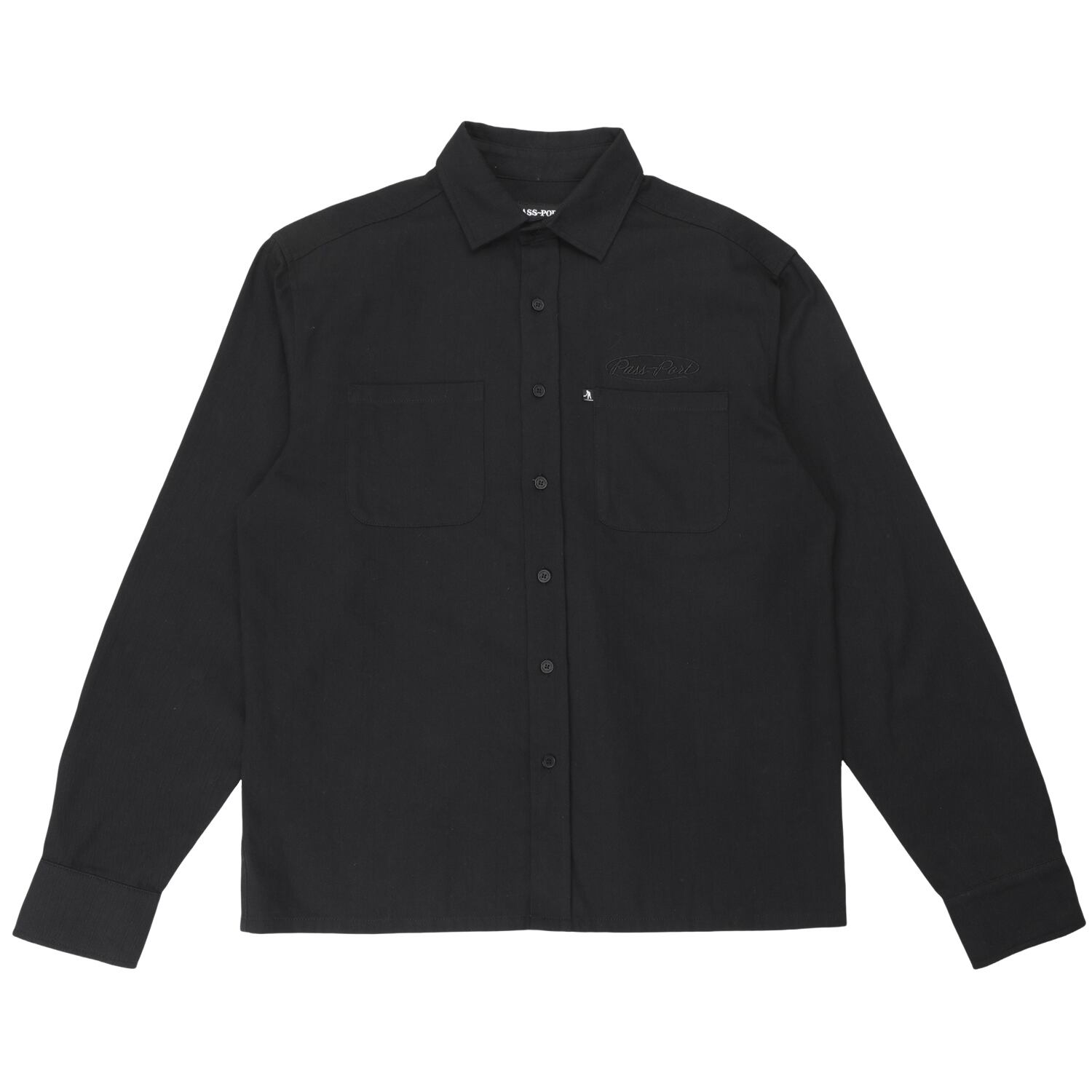 Pass~Port Ovalit Herringboneの長袖シャツ。Ovalitの長袖ボタンアップシャツは綿100%のヘリンボーンで作られており、直接刺繍のディテール、2つのフロントポケット、織ったラベルとリサイクルボタンが特徴です。ボタンにもロゴデザインが施されています。