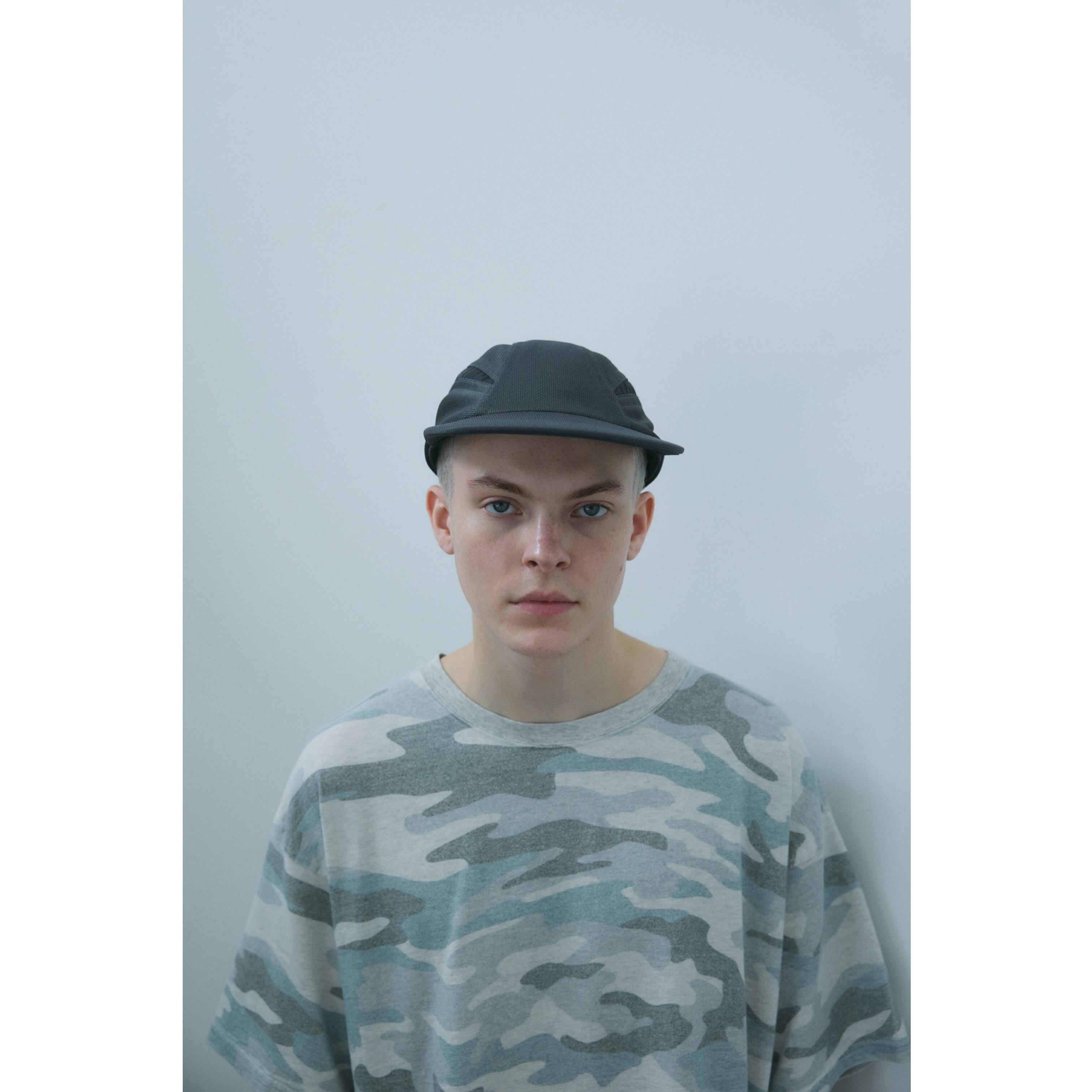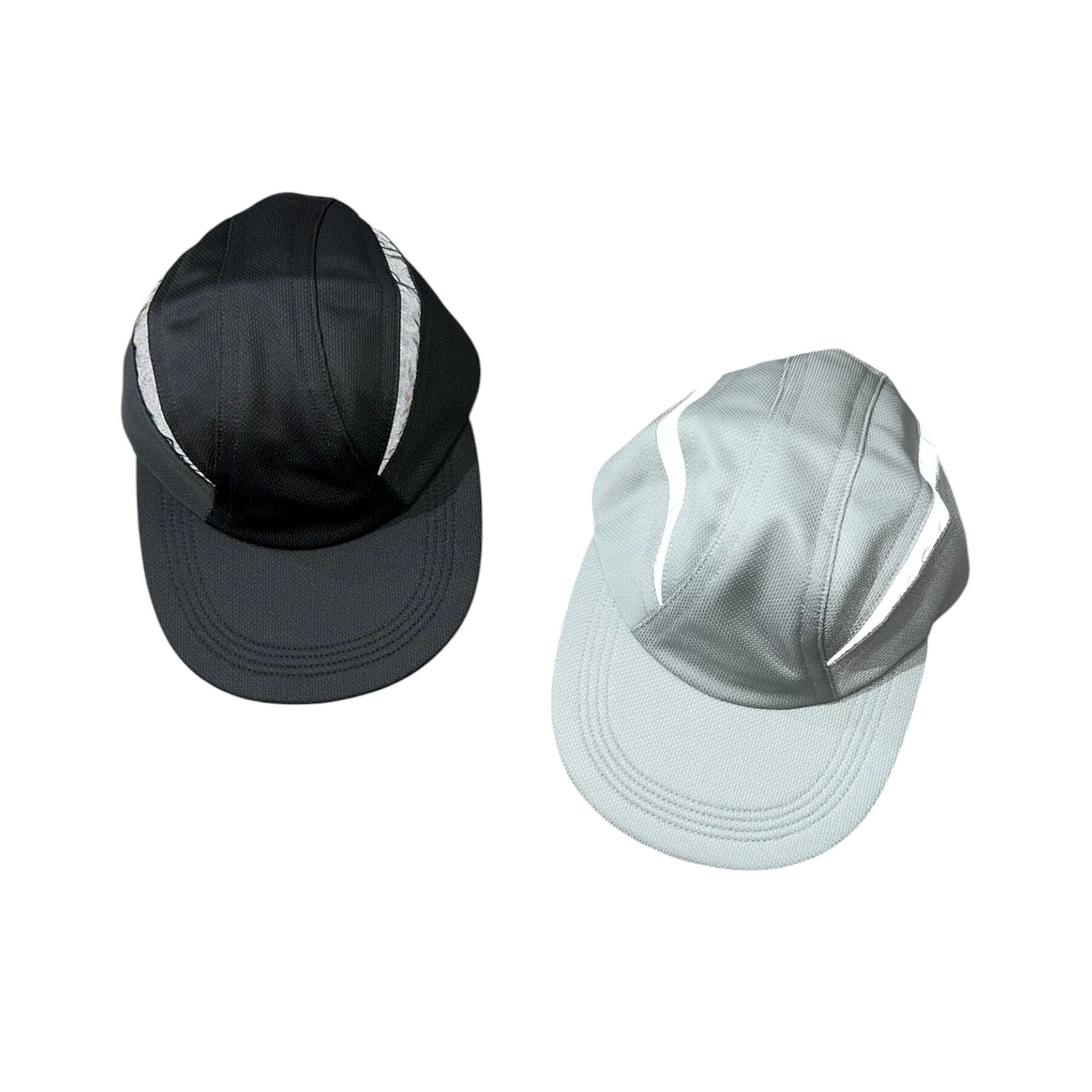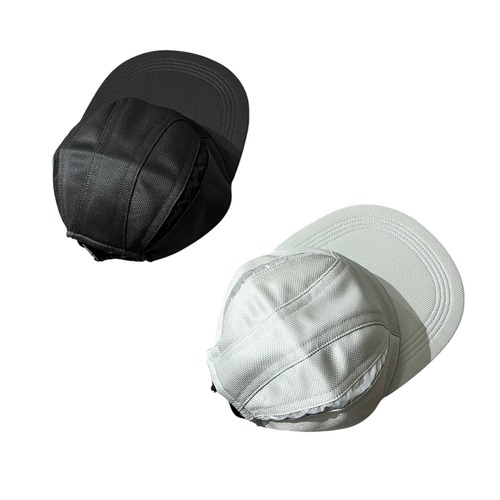 光沢感のある機能素材を使用した全面メッシュ地のCAP。 シャープなラインの切替部分にはリフレクターを配置した フューチャーライクな雰囲気が特徴。