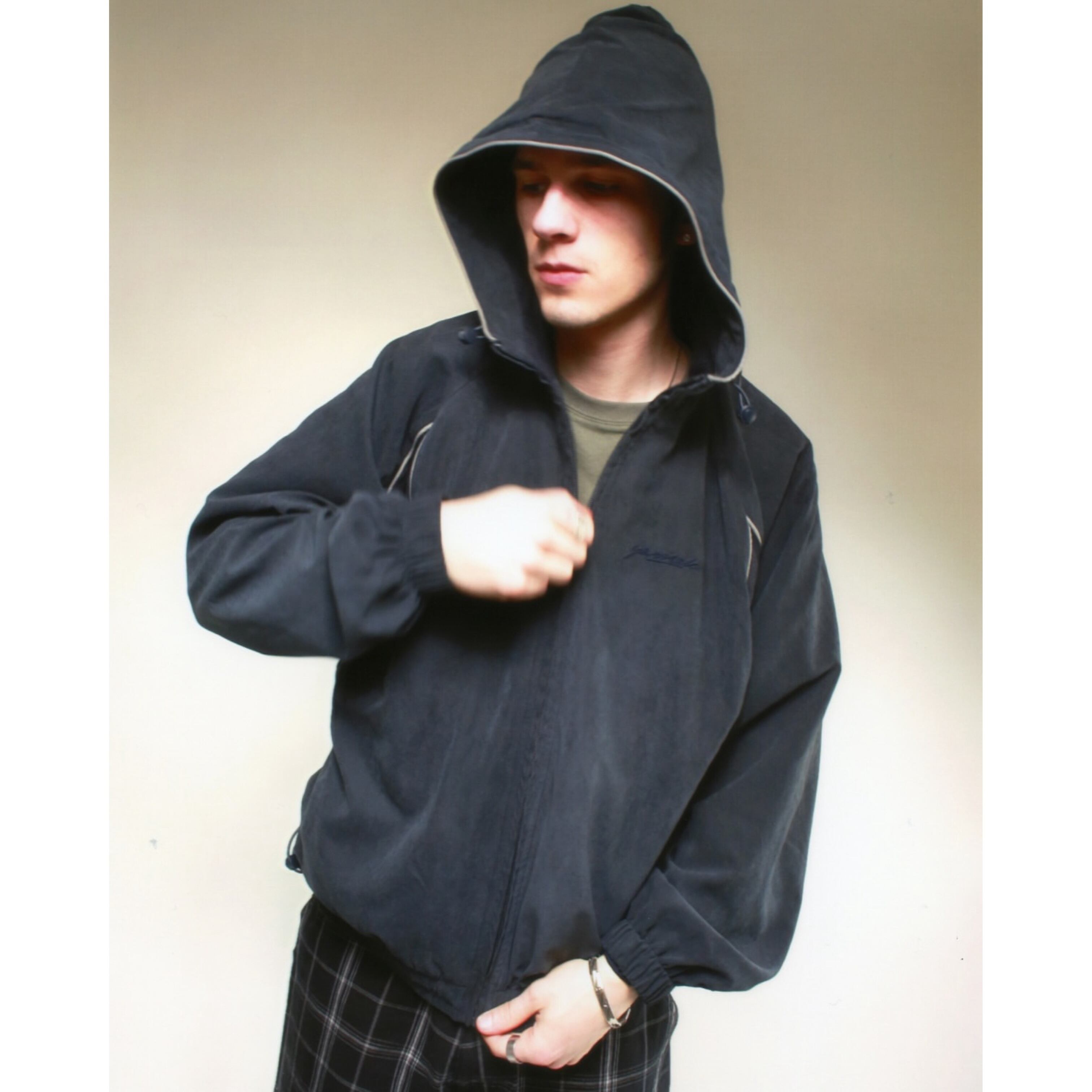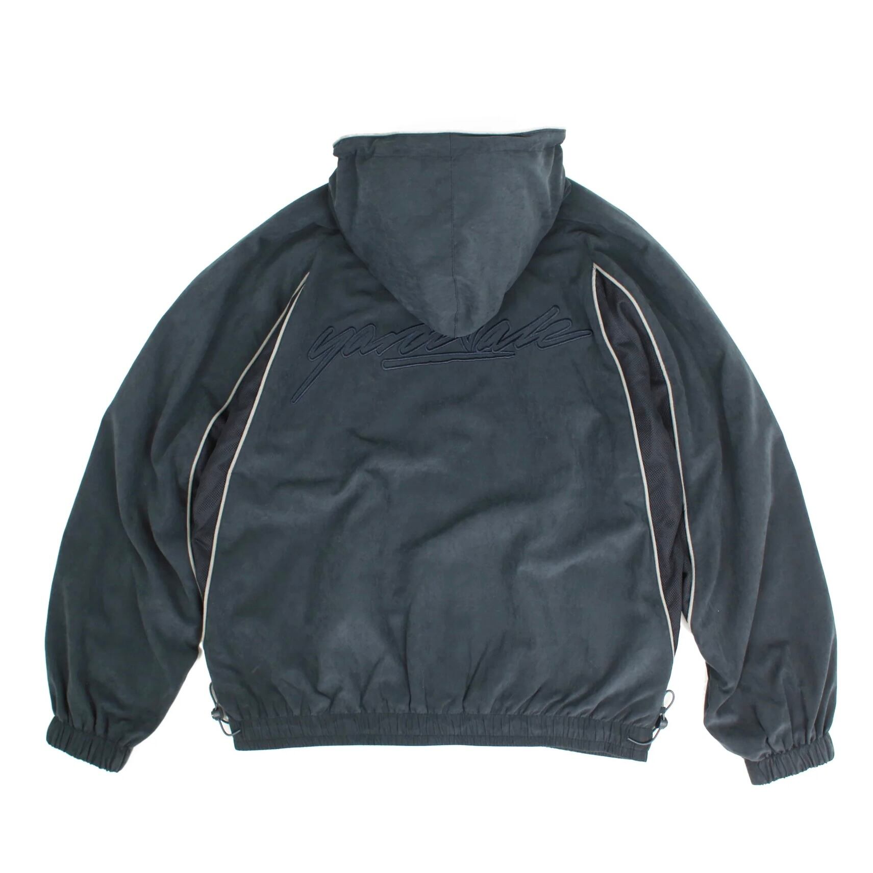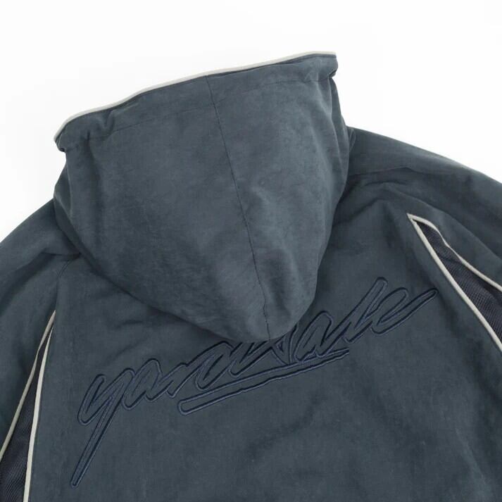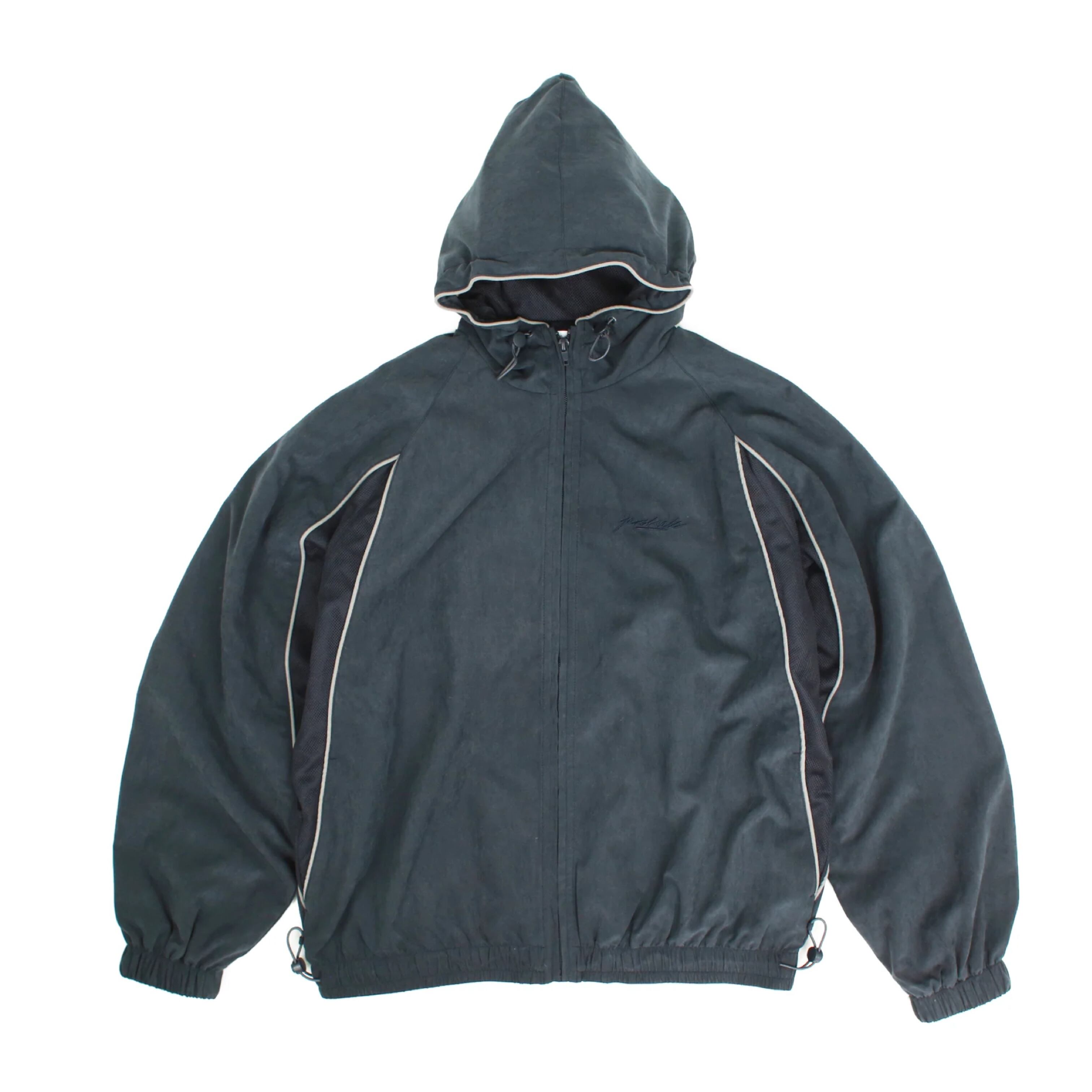 ジップスルーネックフード付きピーチスキントラックスーツトップ。アームなど通気性の良いメッシュ素材の切り替え。フードとアンダーアームのコントラストパイプ。フードと裾に伸縮性のあるドローコードで、丈の調整可能。軽量です。