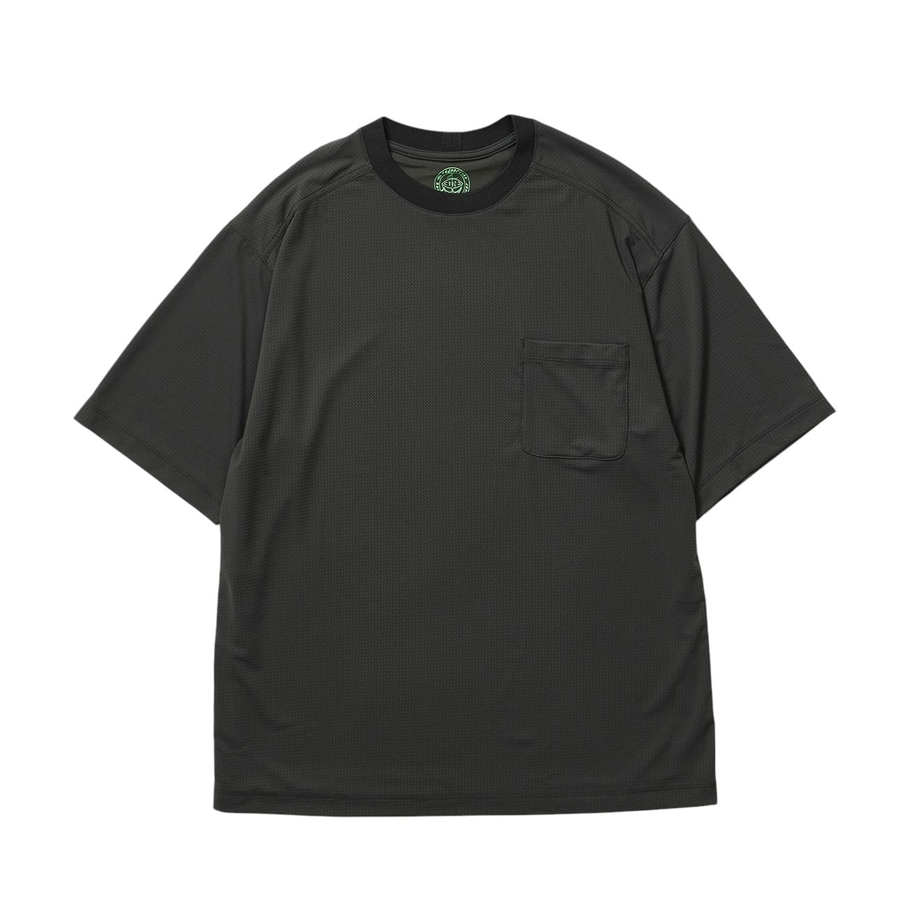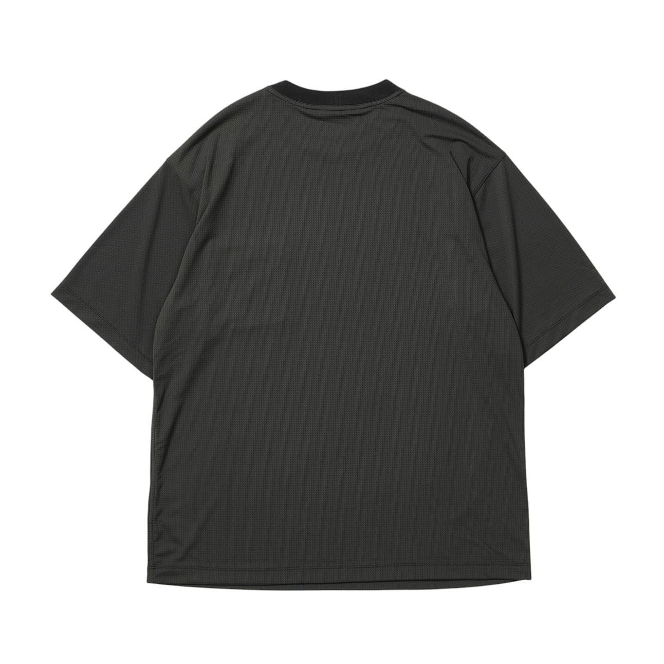 SPORTY S/S TEE COLOR:CEMENT 素材:NYLON86% POLYURETHANE14% SIZE:S, M, L S:着丈69cm 身幅52cm 肩幅49cm 袖丈28cm M:着丈71cm 身幅55cm 肩幅52cm 袖丈28cm L:着丈73cm 身幅60cm 肩幅55cm 袖丈28cm キックバックのよい、柄のようなメッシュ素材をしようしたショートスリーブポケットTEE。ややゆったりなサイズ感。速乾性。