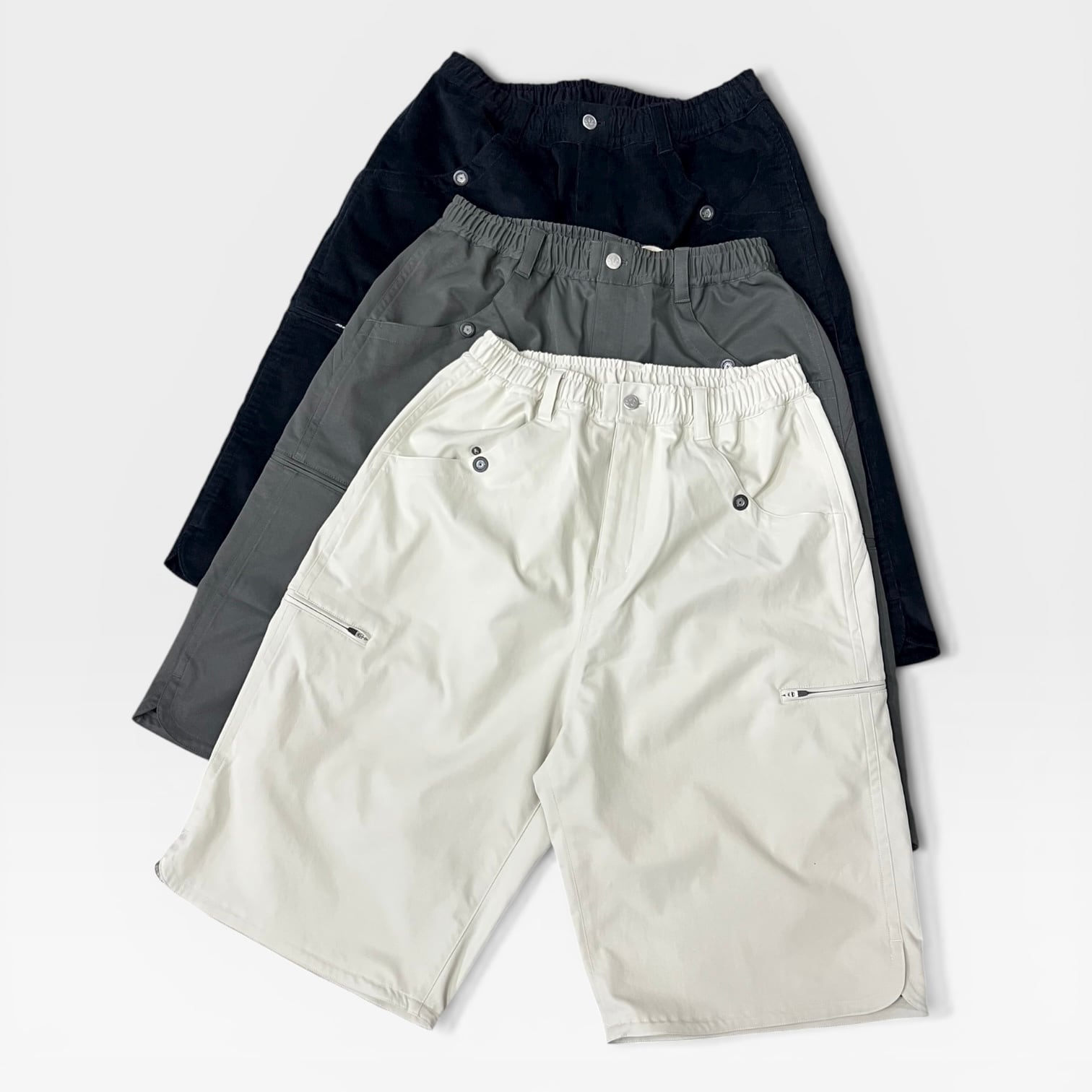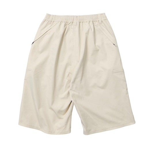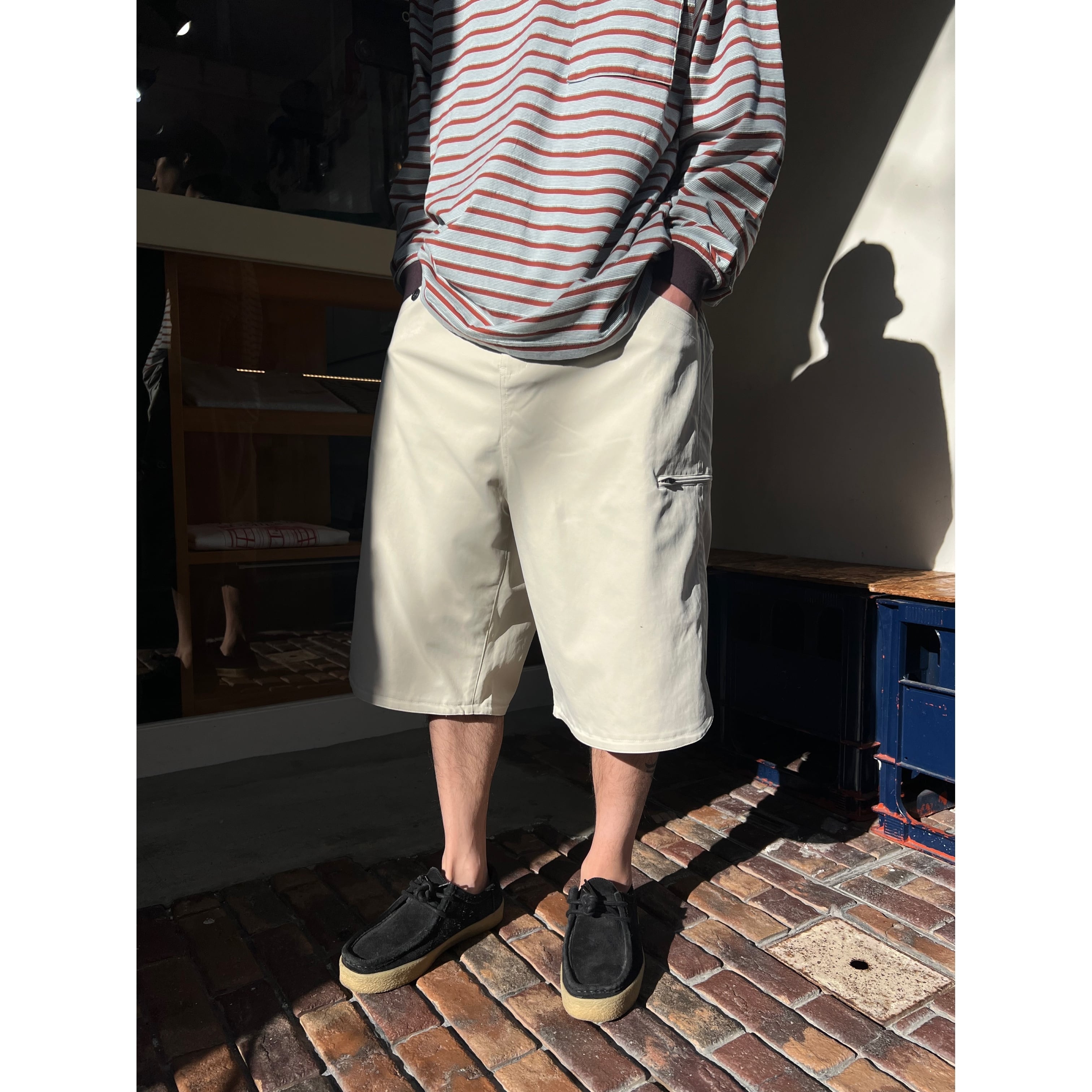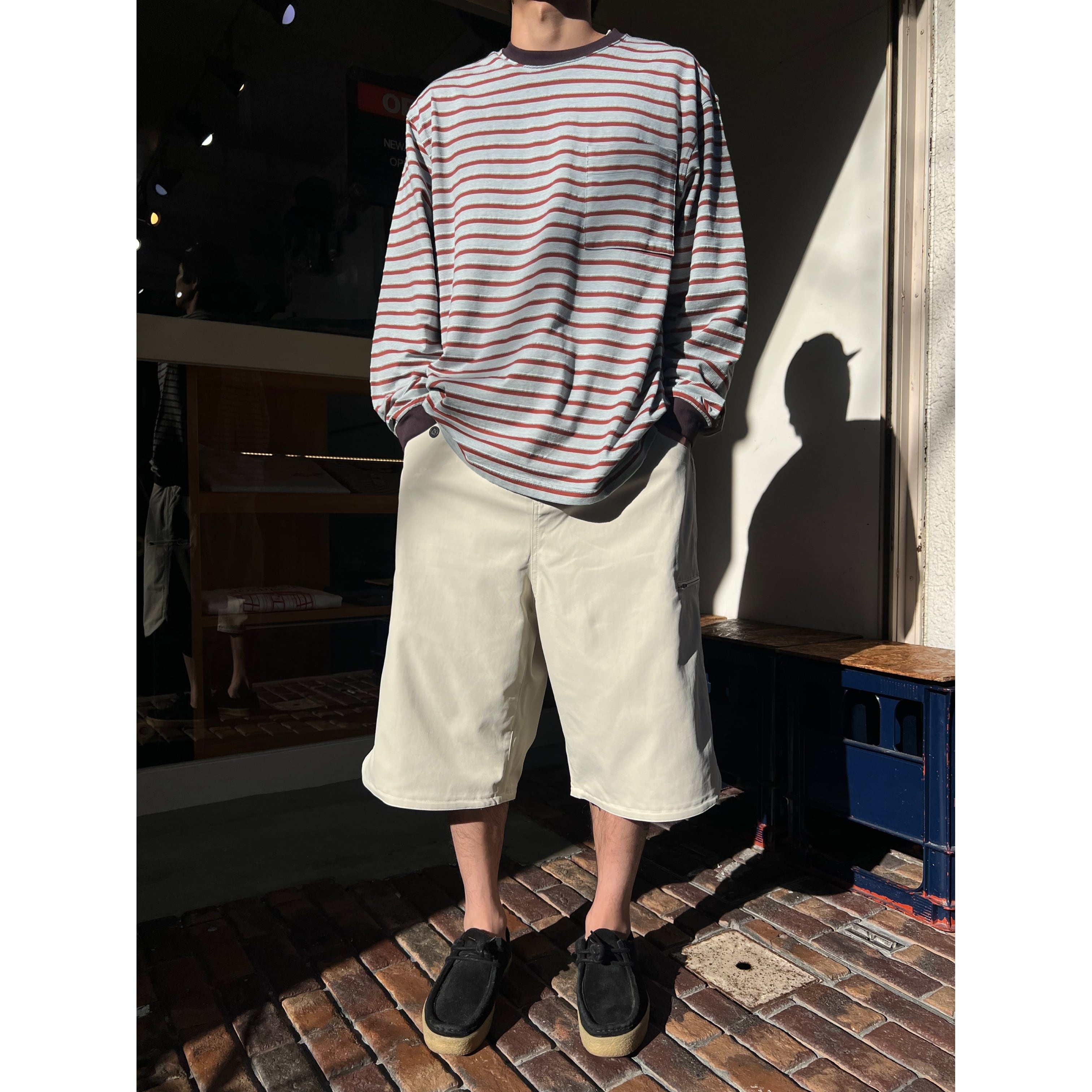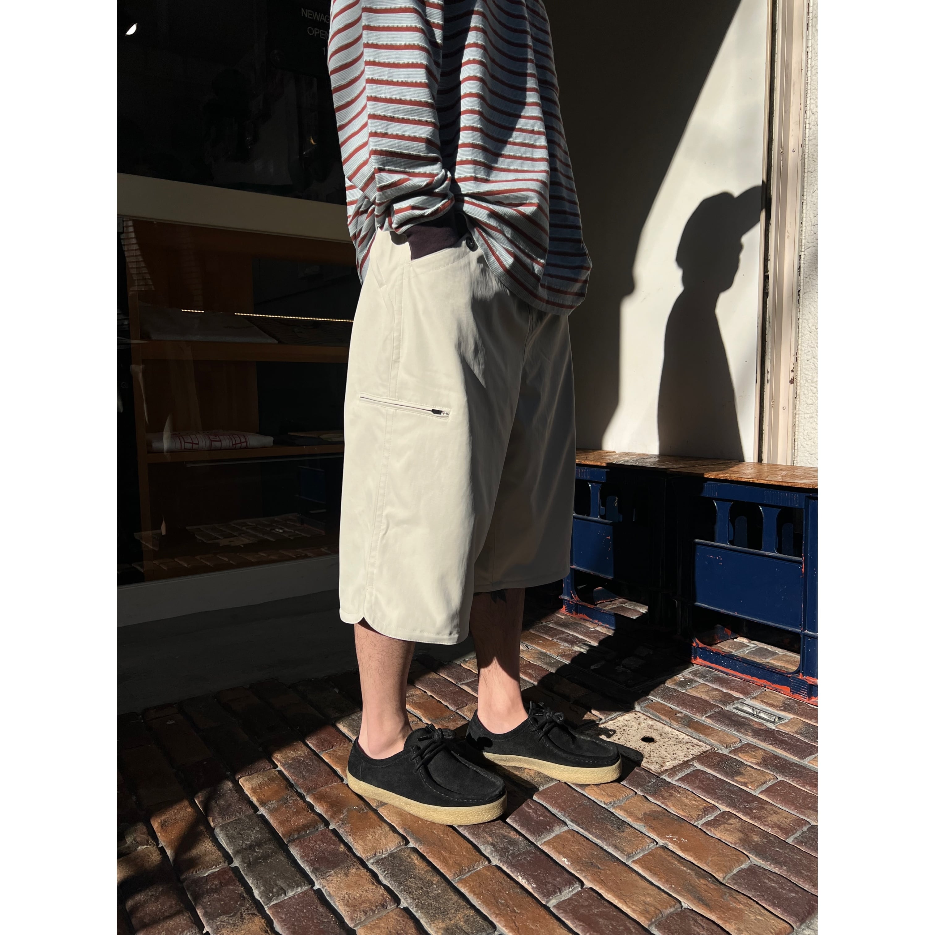 CHINO STRETCH SHORTS COLOR:KINARI MATERIAL:POLYESTER 100% SIZE:M, L M:ウエスト78cm 総丈66cm 裾幅33cm L:ウエスト82cm 総丈70cm 裾幅34cm ワイドストレッチ チノショートパンツ。ワイドでありながら、丈は膝にかかる絶妙なサイズ感での仕上がりです。 170cm / Msize