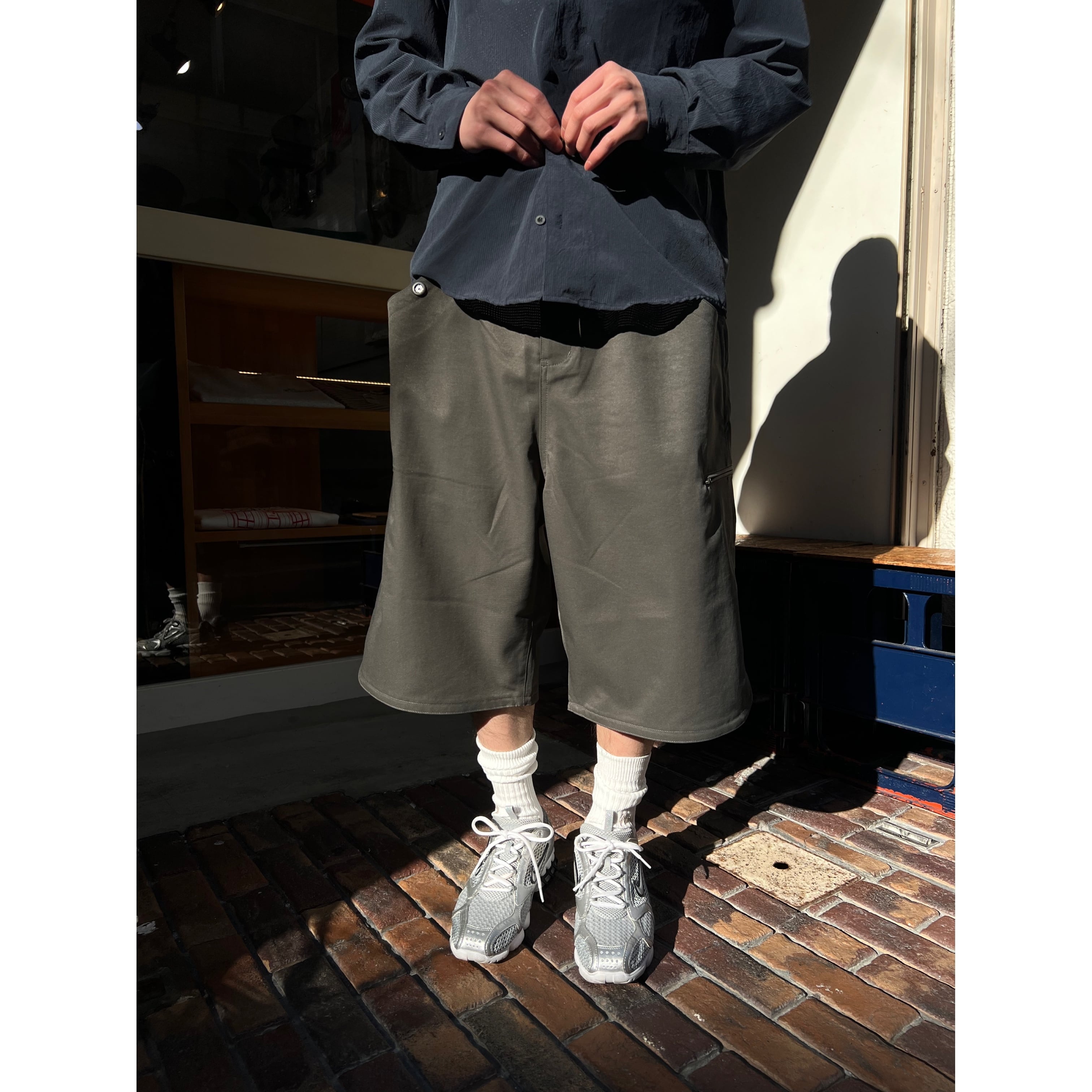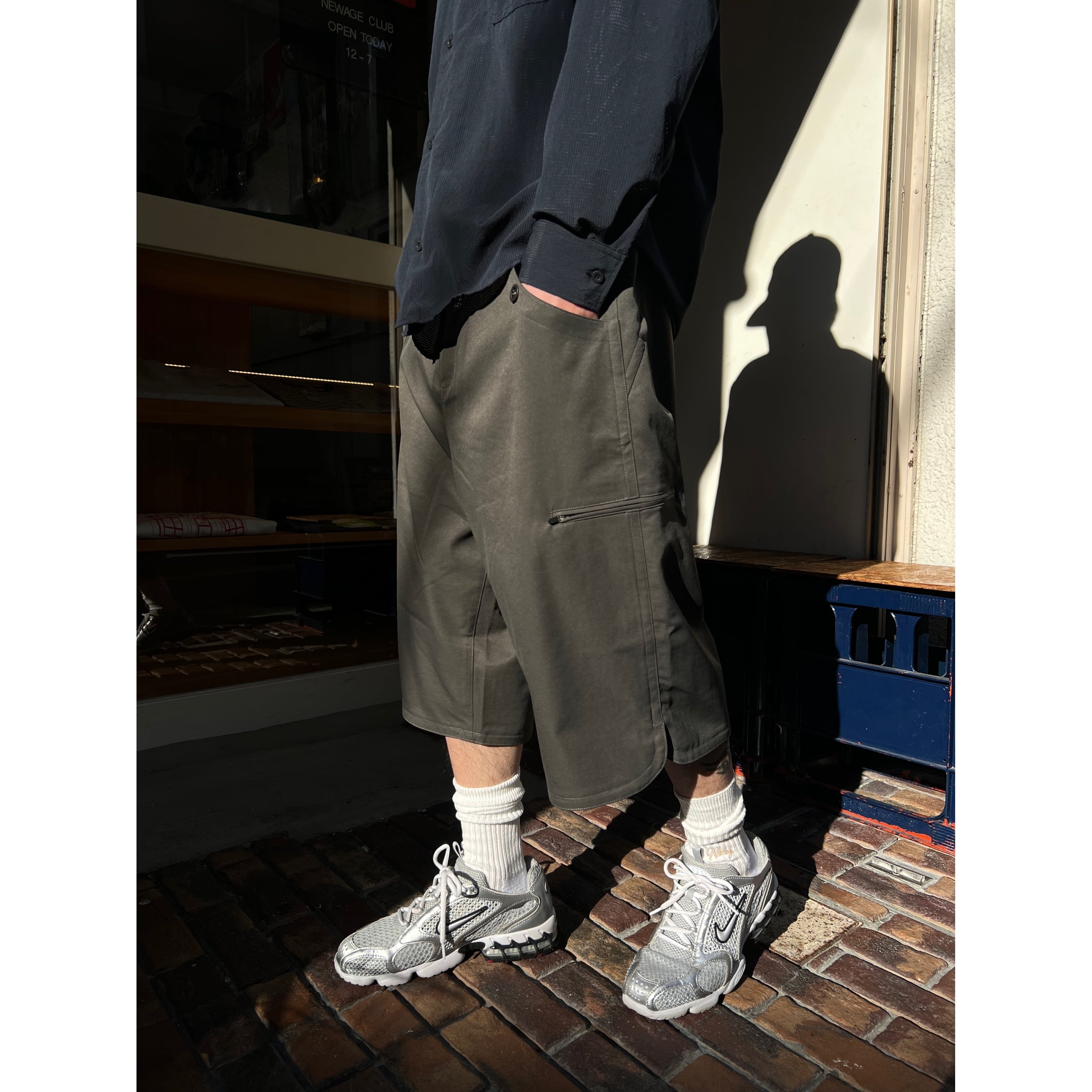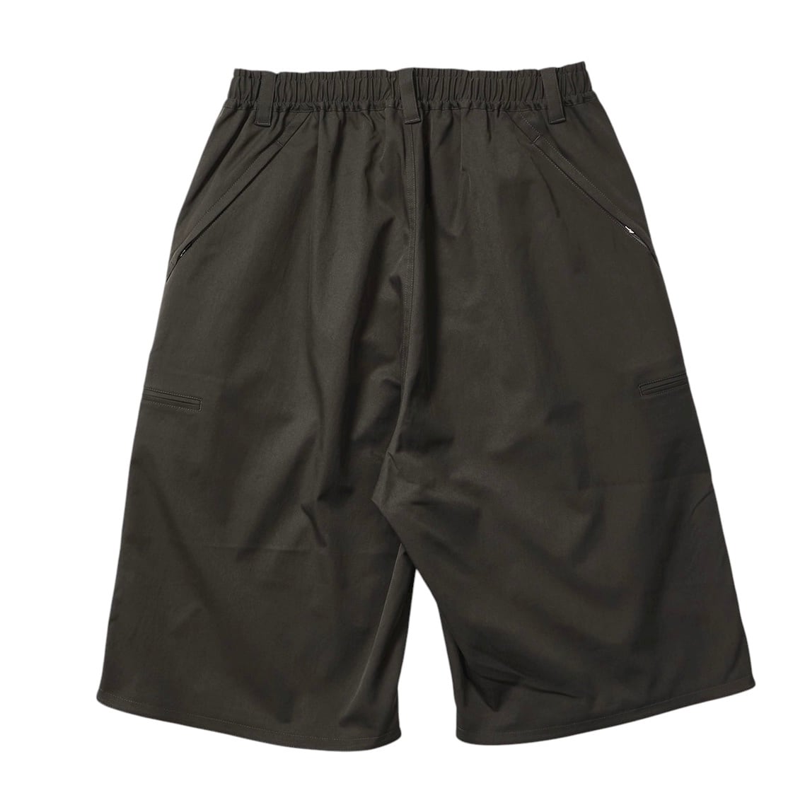 CHINO STRETCH SHORTS COLOR:CHARCOAL MATERIAL:POLYESTER 100% SIZE:M, L M:ウエスト78cm 総丈66cm 裾幅33cm L:ウエスト82cm 総丈70cm 裾幅34cm ワイドストレッチ チノショートパンツ。ワイドでありながら、丈は膝にかかる絶妙なサイズ感での仕上がりです。 170cm / Msize