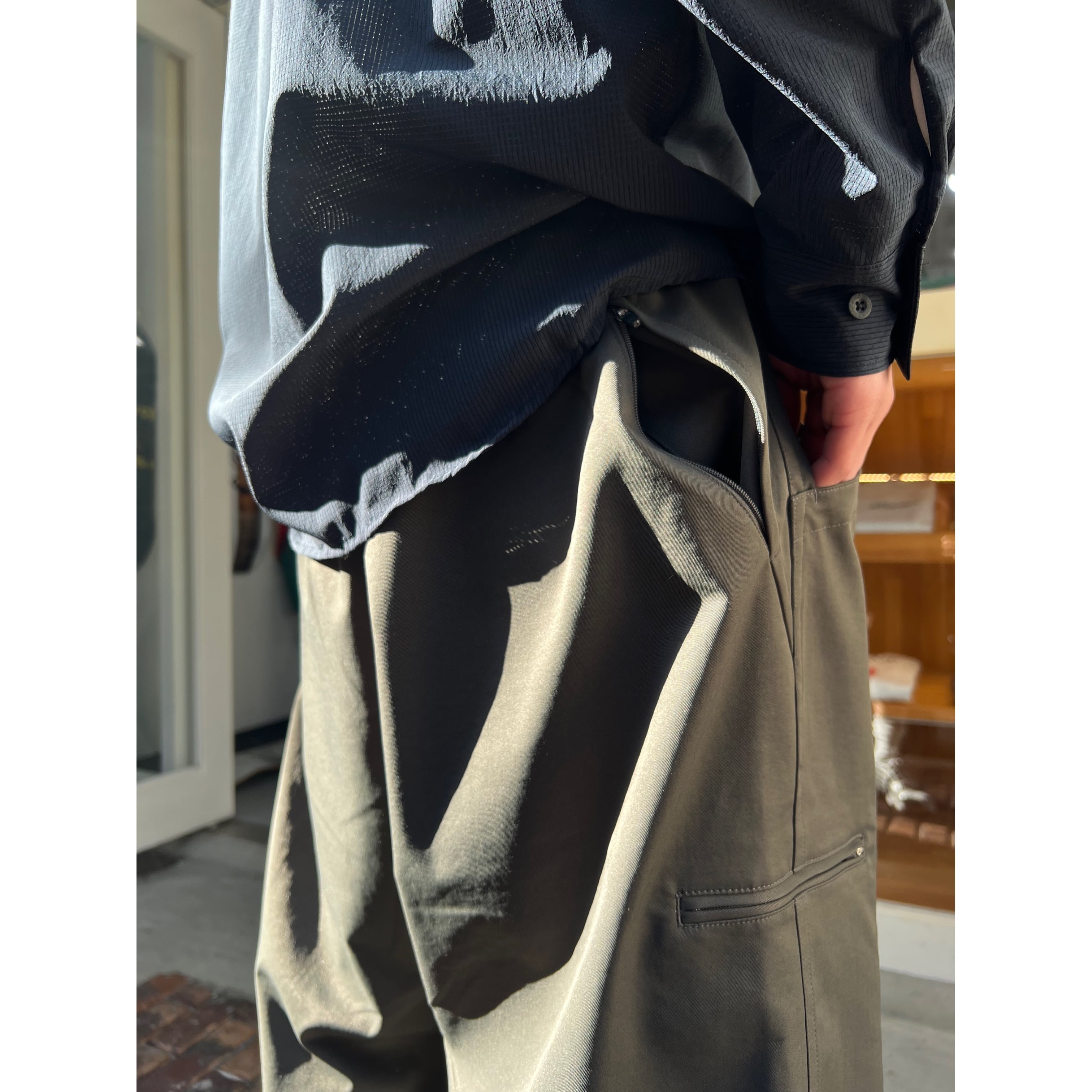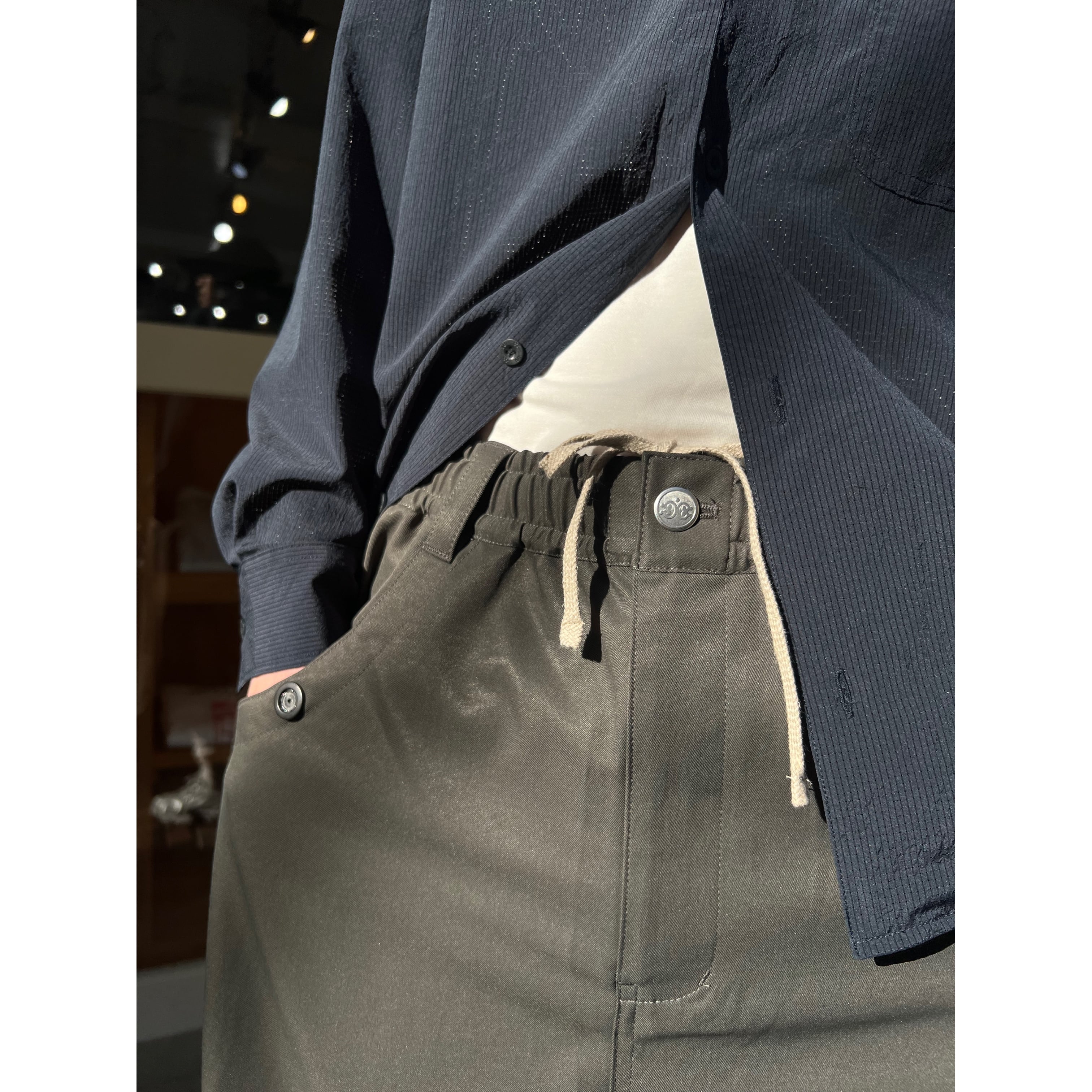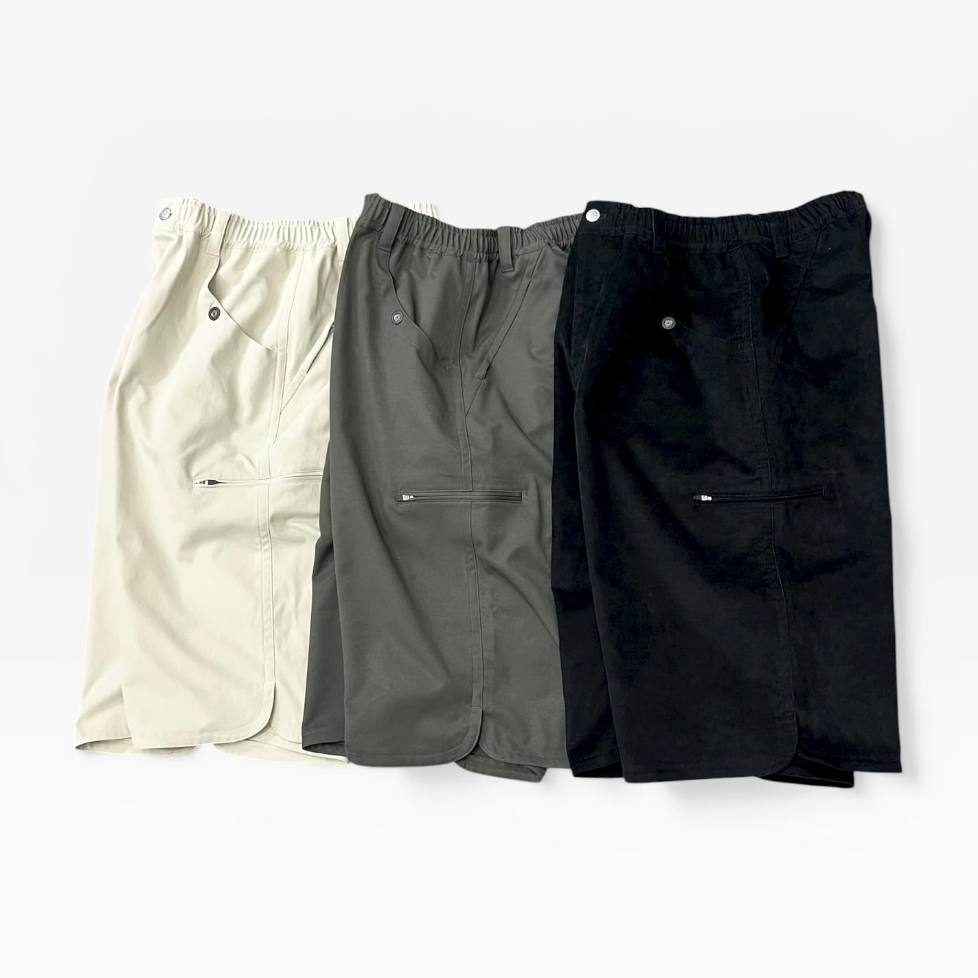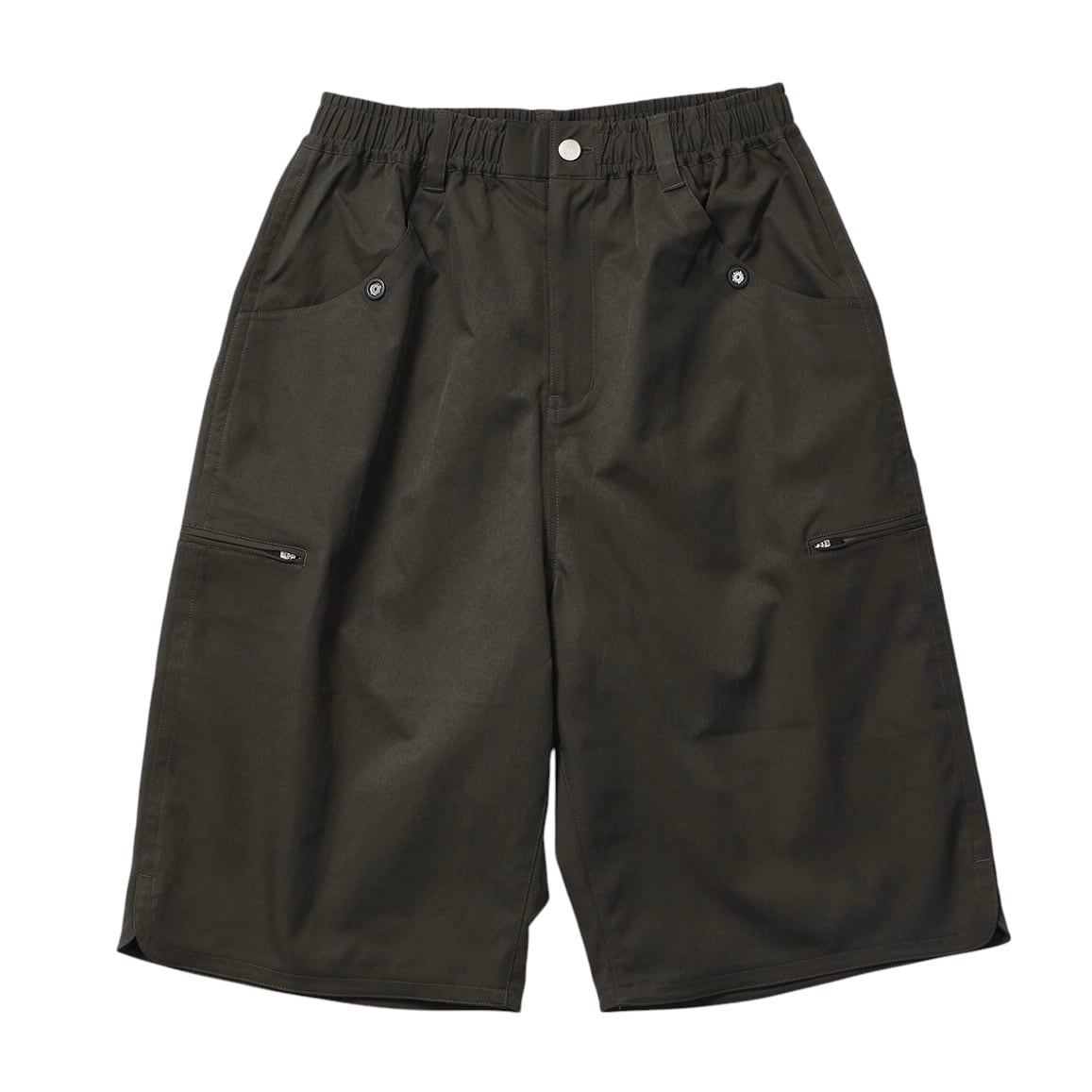 CHINO STRETCH SHORTS COLOR:CHARCOAL MATERIAL:POLYESTER 100% SIZE:M, L M:ウエスト78cm 総丈66cm 裾幅33cm L:ウエスト82cm 総丈70cm 裾幅34cm ワイドストレッチ チノショートパンツ。ワイドでありながら、丈は膝にかかる絶妙なサイズ感での仕上がりです。 170cm / Msize