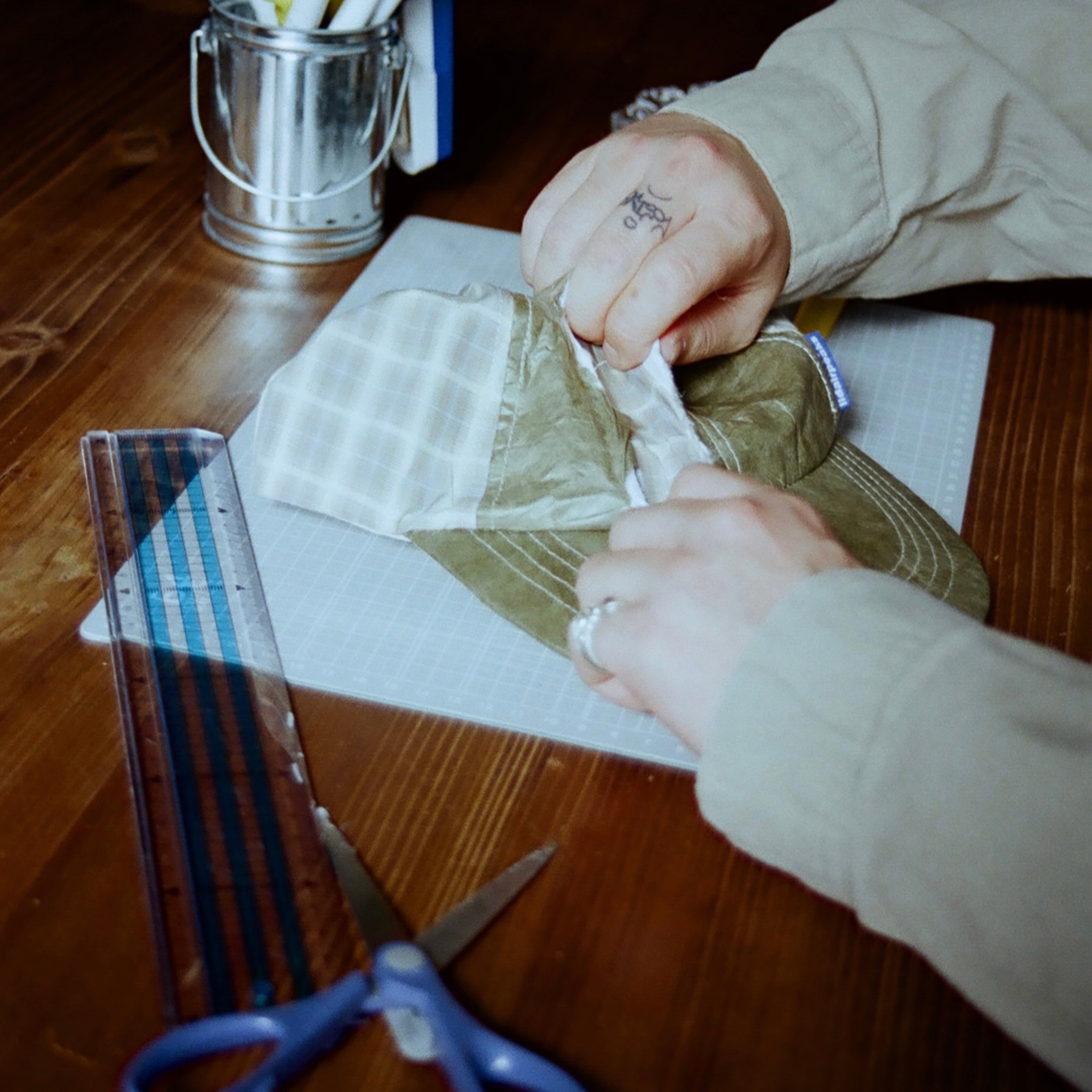 こちらは遊び心満載のアイデア詰まったオールハンドメイドのキャップ。勿論ながらJAPAN MADE。バックのチェック柄がフロント部分の下地にもデザインされているので、被っていくことでの経年劣化や、気分で剥ぐことが可能です。