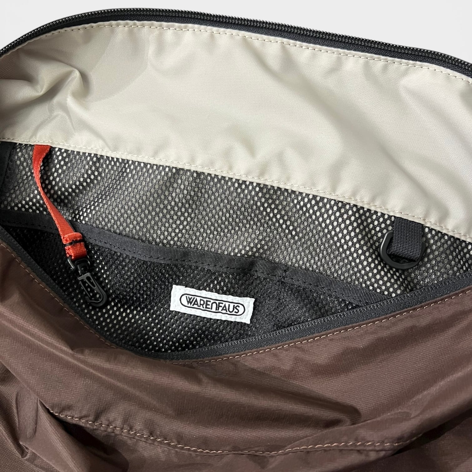 また、旅先での防犯として、外装背面に隠しポケット有り。内装にはメッシュポケットに付随してキーなどをかけれるDカンリングとテープ+ナスカンパーツにより、バッグ内の小物に快適にアクセス可能です。