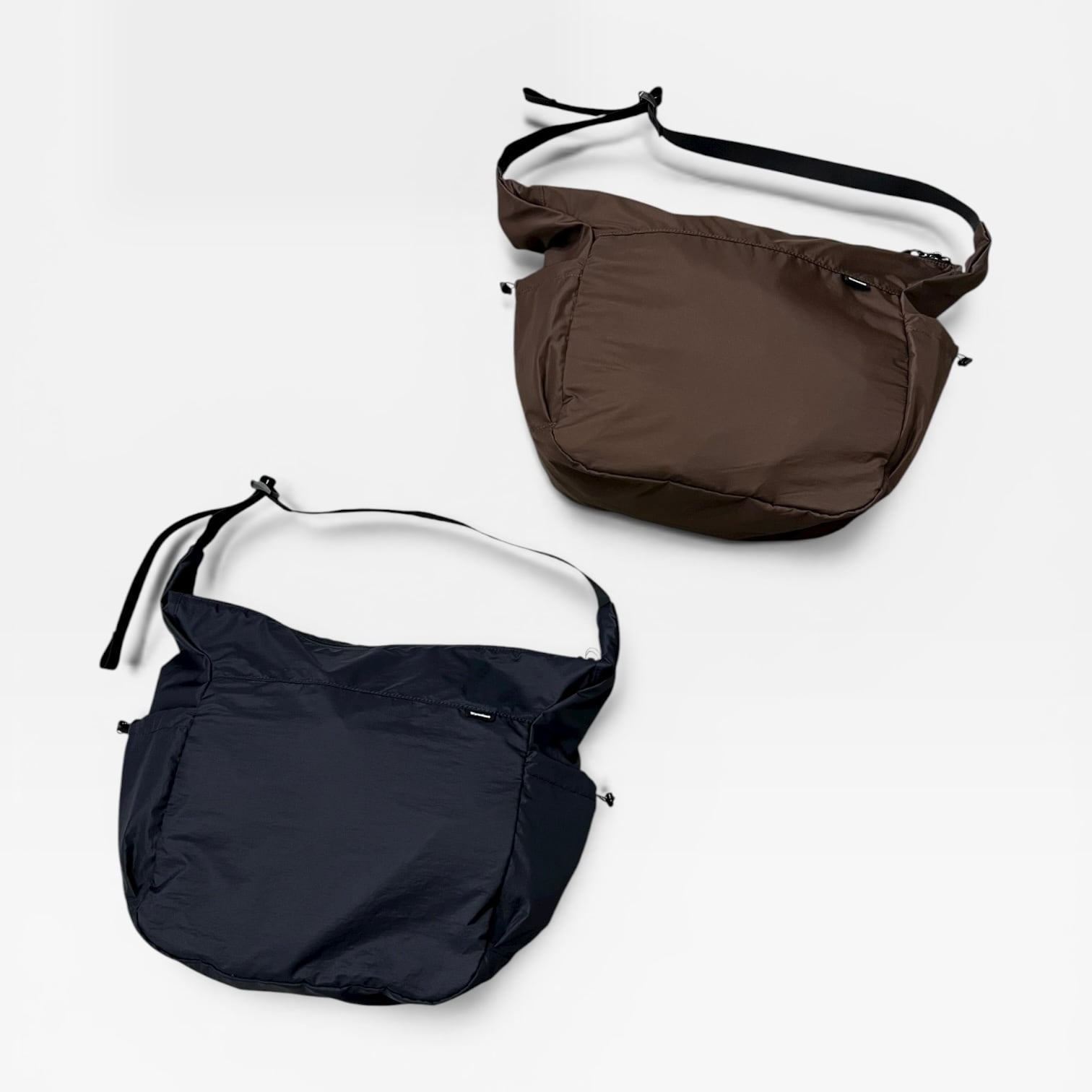 今シーズンは撥水性のある極細番手を使用した超軽量マイクロリップストップを採用。裏面のコーティングにより適度なハリとシワ加工による凹凸のある表面感が特徴です。長さ調整が可能なショルダーストラップは先端に指を引っ掛けるループが付いている為、片手で長さ調整可能です。