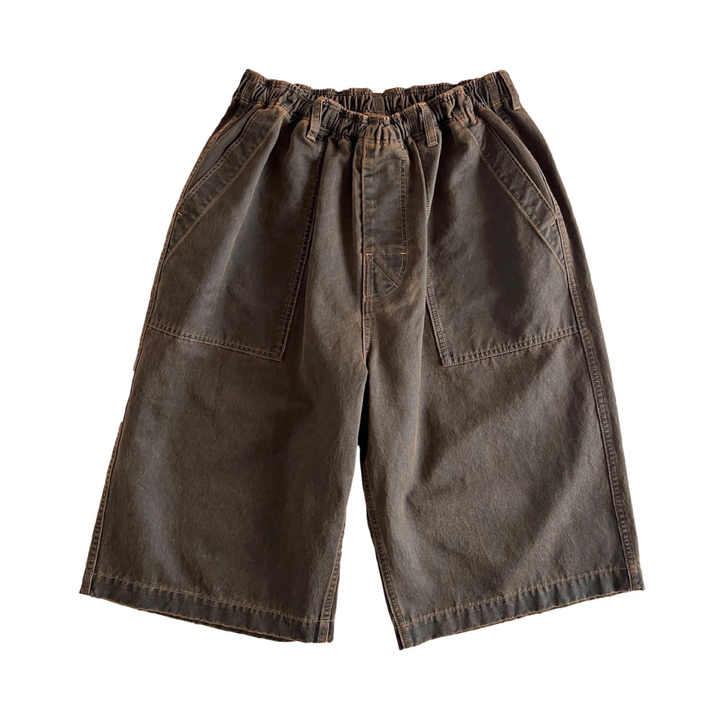 植物性ワックスによる独特なエイジング感が特徴の生地を使用した ベイカーショーツ。25SSのDenim Buggy Shortsから股上を浅くしたスッキリとしたシルエット。 丈の長さは変わりありません。 ウエストはゴム仕様ながらベルトループも付くので タックインでの着こなしにも対応。