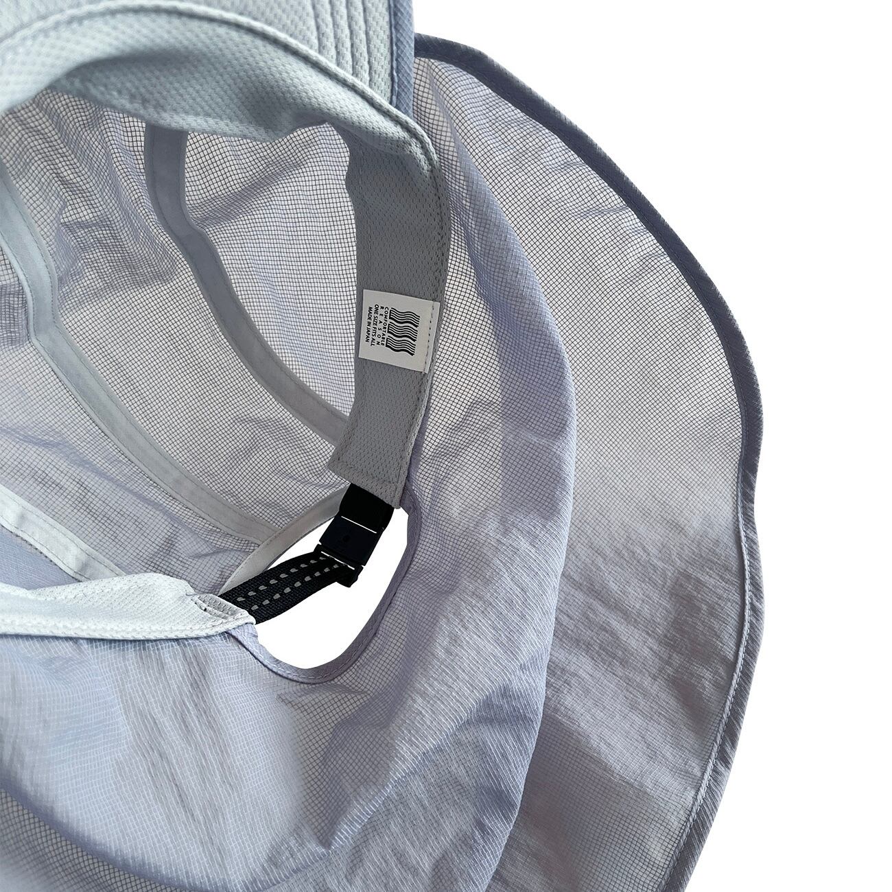 透け感あるナイロンリップストップを使用した Shade Cap。紙のようなハリ感と軽やかさにナイロン特有のドライタッチを兼ね備えた 涼しげなアイテム。スベリ ( 汗止め ) とツバ裏部分には吸水速乾とUV カット機能のメッシュ地を採用。 バックのアジャスターテープはリフレクター付きで ツバは折り畳んで持ち運びも可能なソフトタイプ。