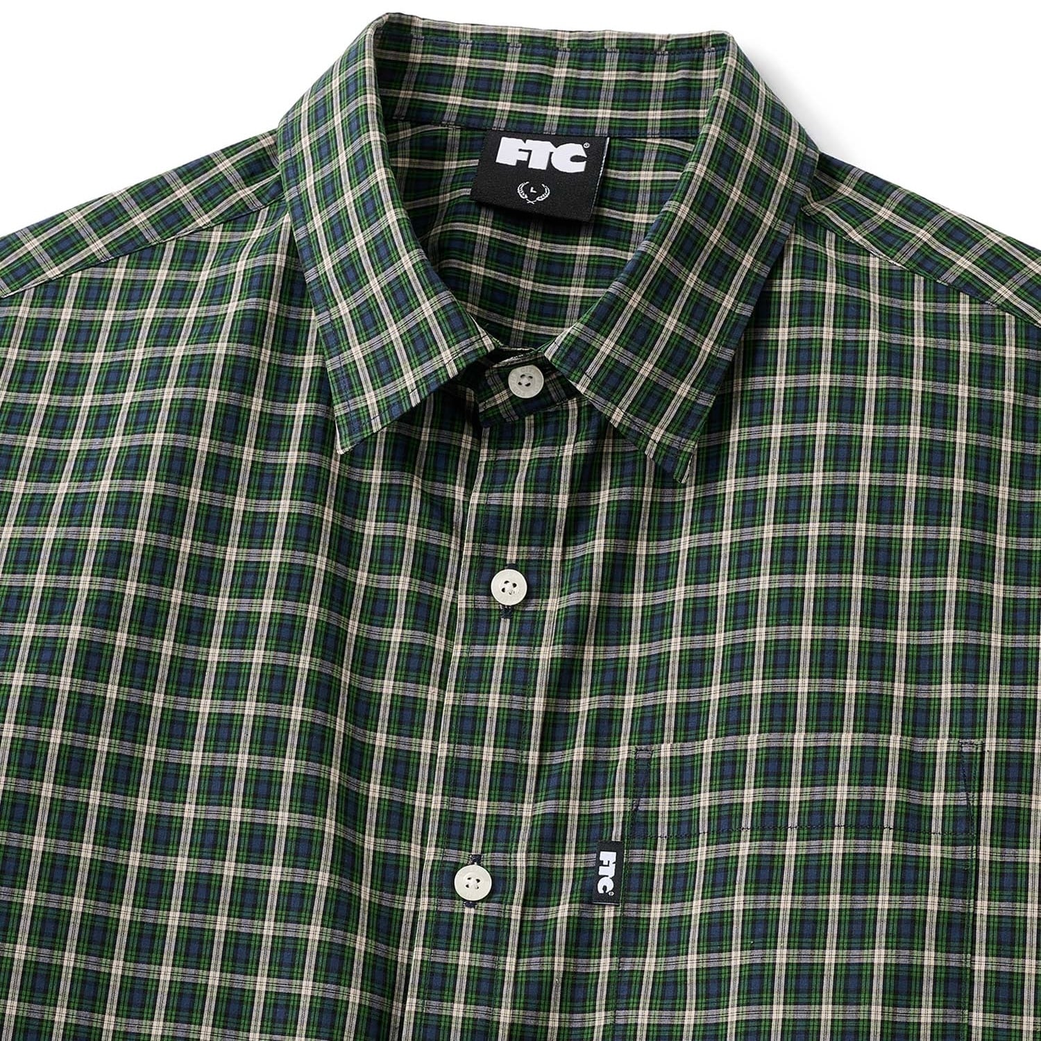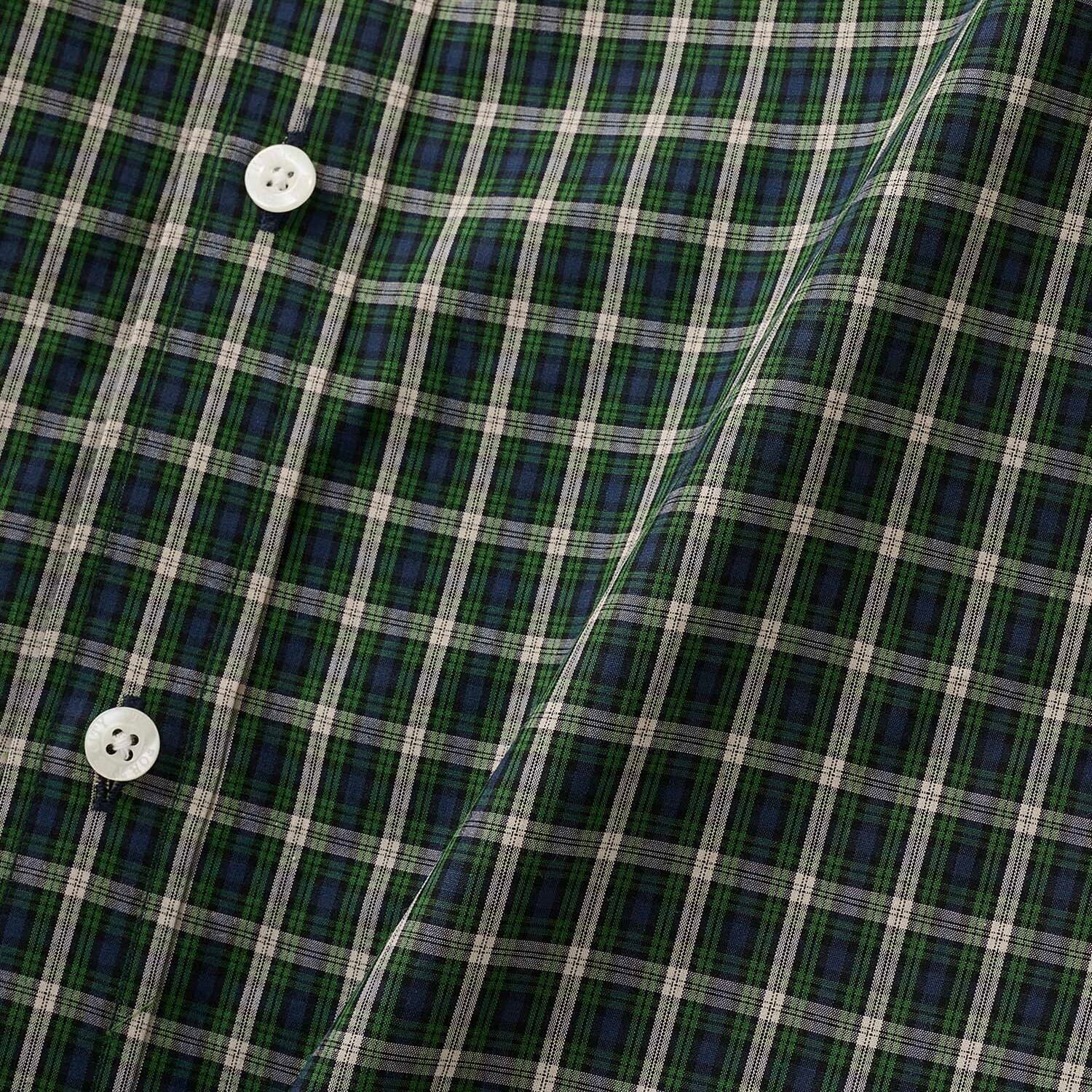 M:着丈72cm 身幅60cm 肩幅51cm 袖丈24cm L:着丈75cm 身幅63cm 肩幅51cm 袖丈24cm XL:着丈78cm 身幅66cm 肩幅53cm 袖丈26cm コットンチェックを使用した半袖シャツ。バックヨークにハンガーループ。オリジナルボタン。左胸ポケットにピスネーム。 All cotton.