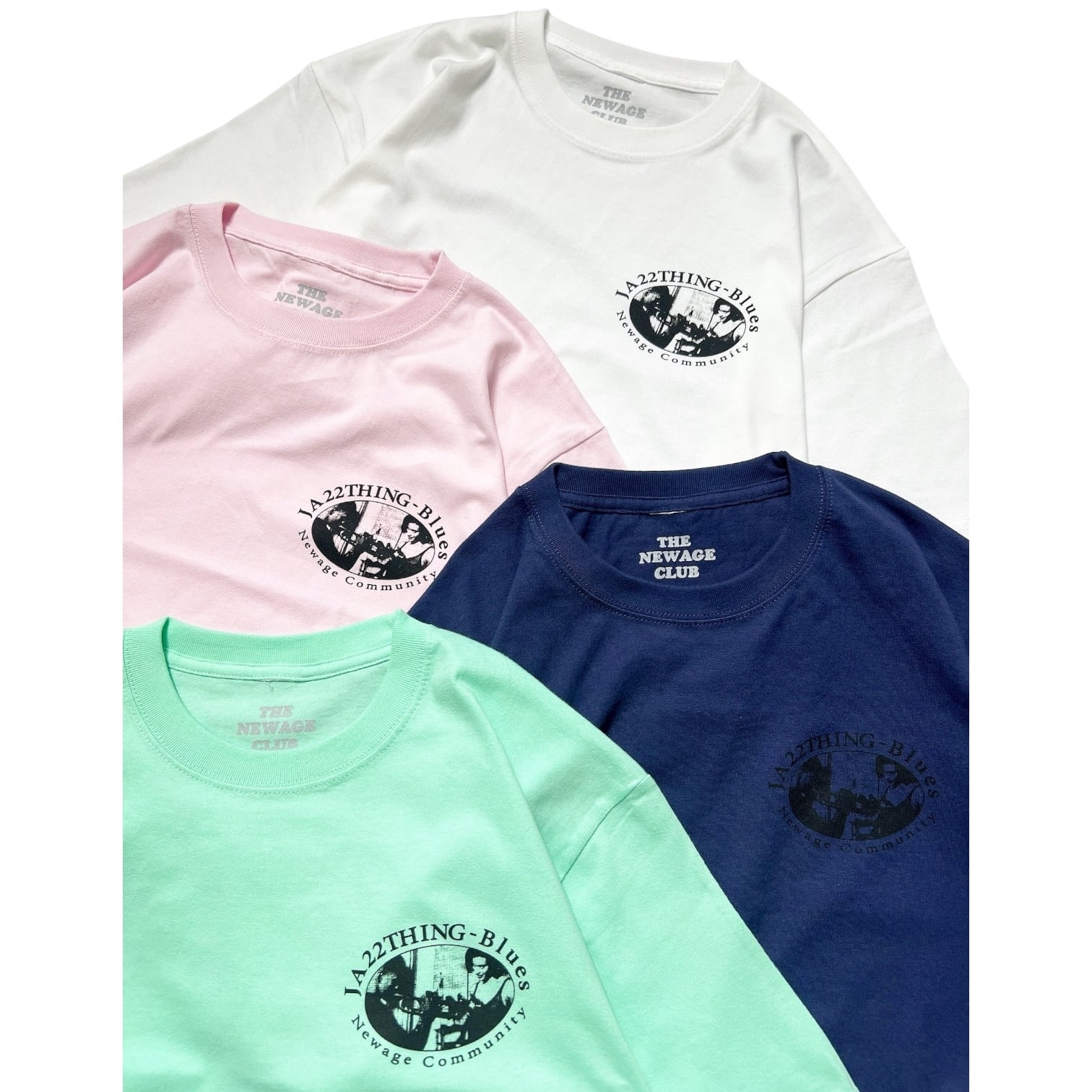 これまでのNewage Clubのオリジナルと比べ、今回は敢えてプリントの色数をギュッと絞り、外せないホワイトボディーから、夏感のある明るいメロン、ライトピンク(この様なボディーカラーも初めて)で、ネイビーは好きで割とよく出すので、今回は少しトーンの明るいインディゴの合計4色展開で製作してみました。