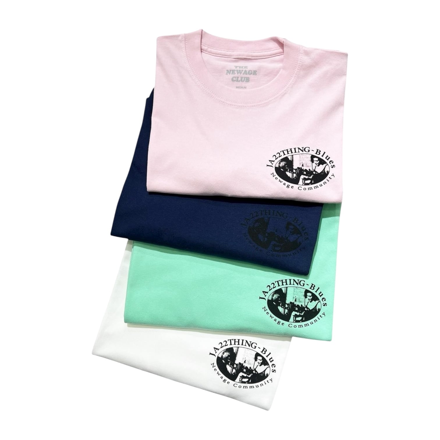 これまでのNewage Clubのオリジナルと比べ、今回は敢えてプリントの色数をギュッと絞り、外せないホワイトボディーから、夏感のある明るいメロン、ライトピンク(この様なボディーカラーも初めて)で、ネイビーは好きで割とよく出すので、今回は少しトーンの明るいインディゴの合計4色展開で製作してみました。