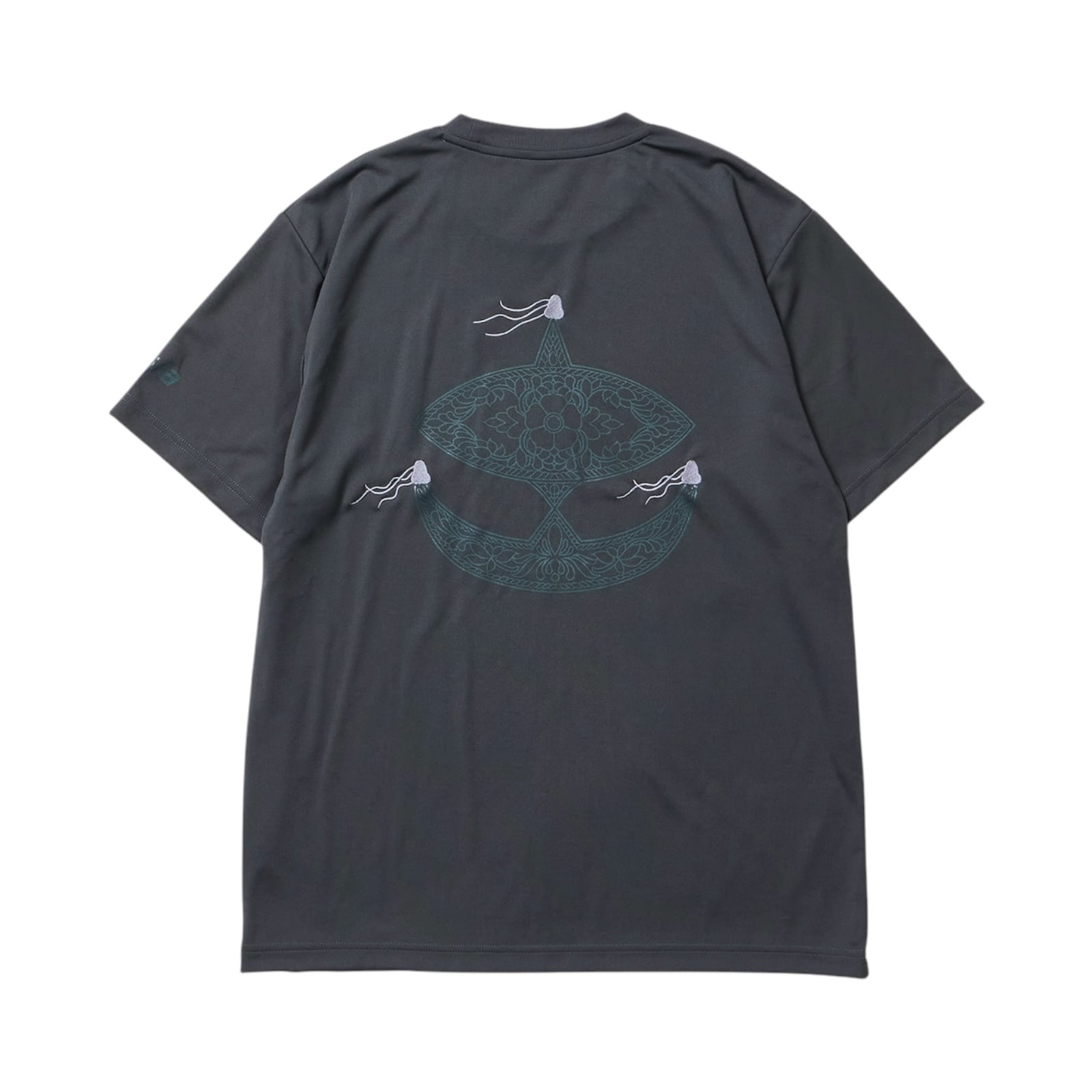 M:着丈71cm 身幅53cm 肩幅47cm 袖丈21cm L:着丈74cm 身幅55cm 肩幅50cm 袖丈23cm XL:着丈77cm 身幅57cm 肩幅53cm 袖丈25cm 吸汗性と速乾性に優れた機能をハックしてくれるポリエステルメッシュ素材のボディにブランドロゴでもある凧を背面にプリント。フロントにはラジャブルック蝶モチーフロゴ。刺繍したTEEになります。素材、プリント、刺繍共に一手間加えた1着になります。ドライ生地。 Polyester 100%