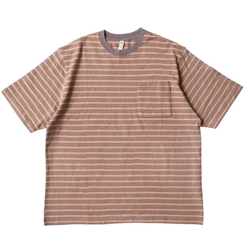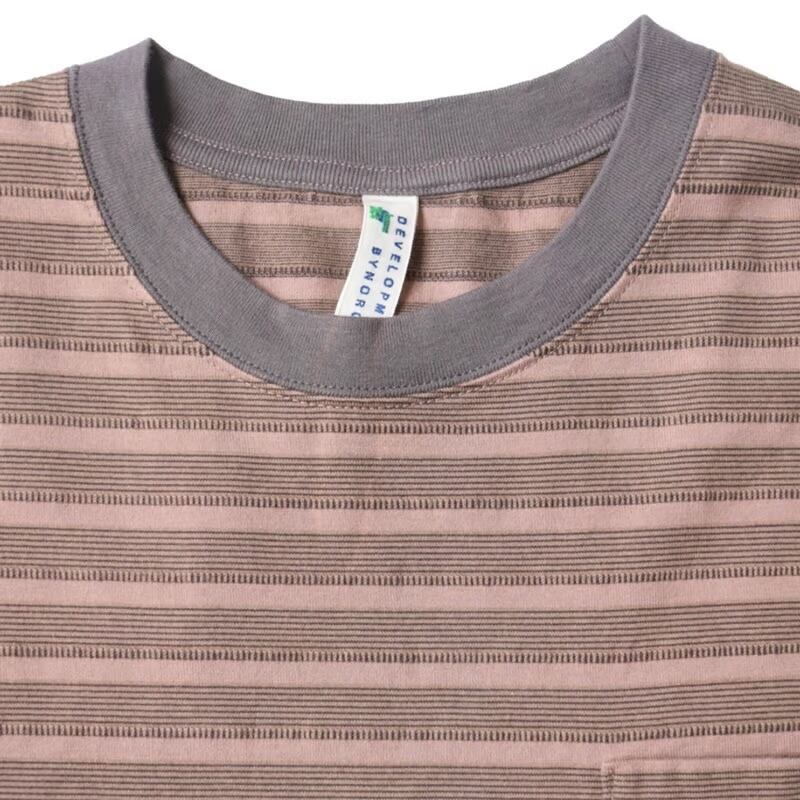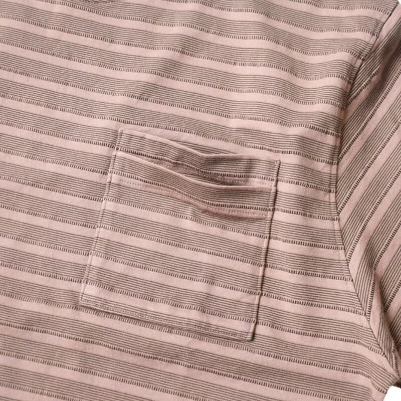 昨年から作っているオリジナル生地のボーダー+ジャガードのTee、今年は縦にジャガードを入れています。ベースのカットソーを編み立てた上からを縦線部分をジャガードで加工している凹凸あるオリジナル生地。今回ポケットはダブルポケット、ベースのカットソーの生地感が23ssよりも薄手です。さらにタンブラーをかける事で偶然生まれた縮率差によるカットソーとジャガードの凹凸が強調される不均一な表情が特徴。
