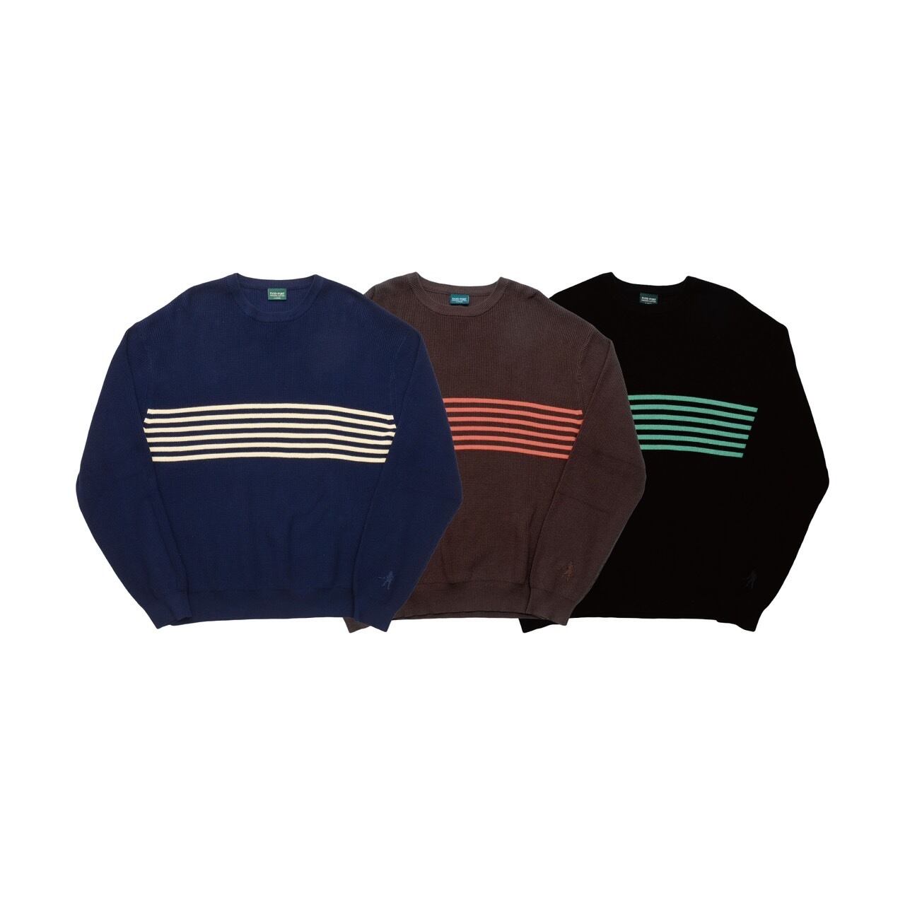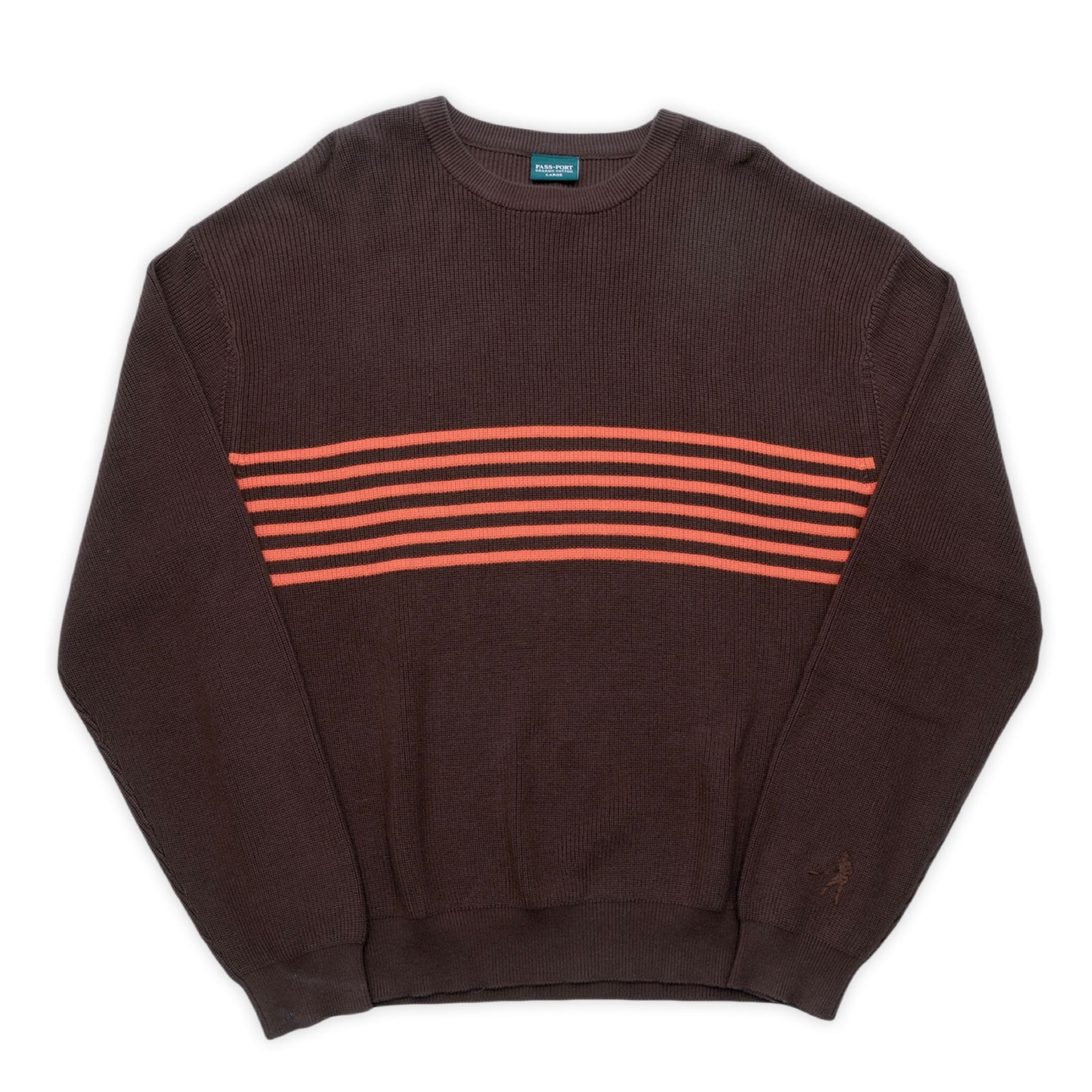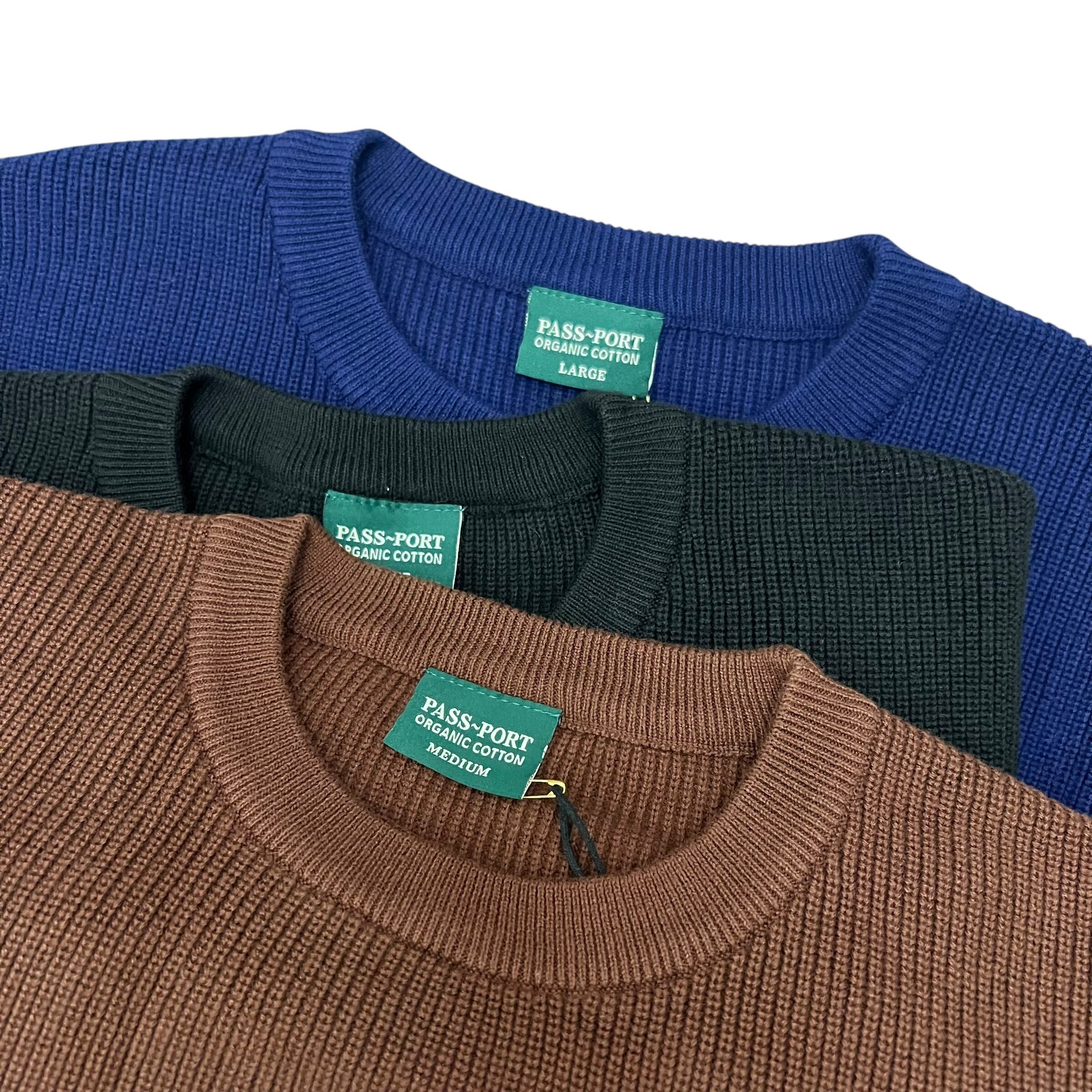 Pass~Port Organic cotton knit sweater from the organic department for range #43. The organic knit is made from 100% organic grown cotton woven into a waffle knit and features direct embroidered digger on left sleeve.